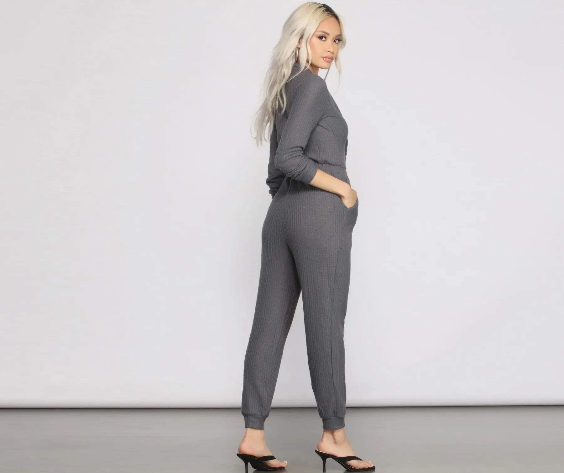 Keep it chic and cozy in a jumpsuit that keeps your look on point this season! Perfect for a chill lounge look or creating a head-turning streetwear outfit.?The jumpsuit features a plunging surplice neckline. long sleeves. an elastic waist with a tie-waist belt to create a customized fit. trendy side pockets. and composed of a smooth to the touch cashmere-like ribbed fabric. Complete your look with??and layers of?.