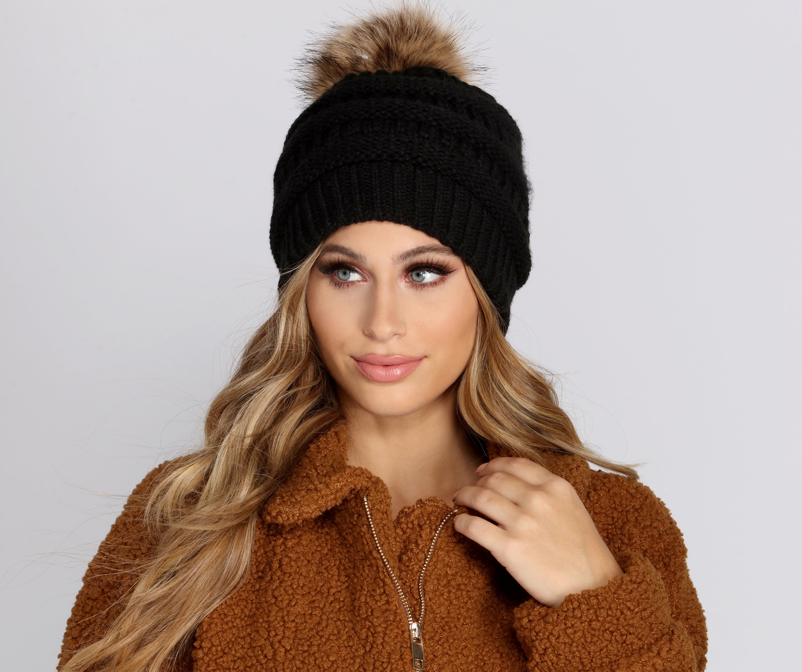 Keep it cozy and cute with this beanie! It features a horizontal cable knit design. a ribbed brim. a soft sherpa inside. and a faux fur pom pom accent.