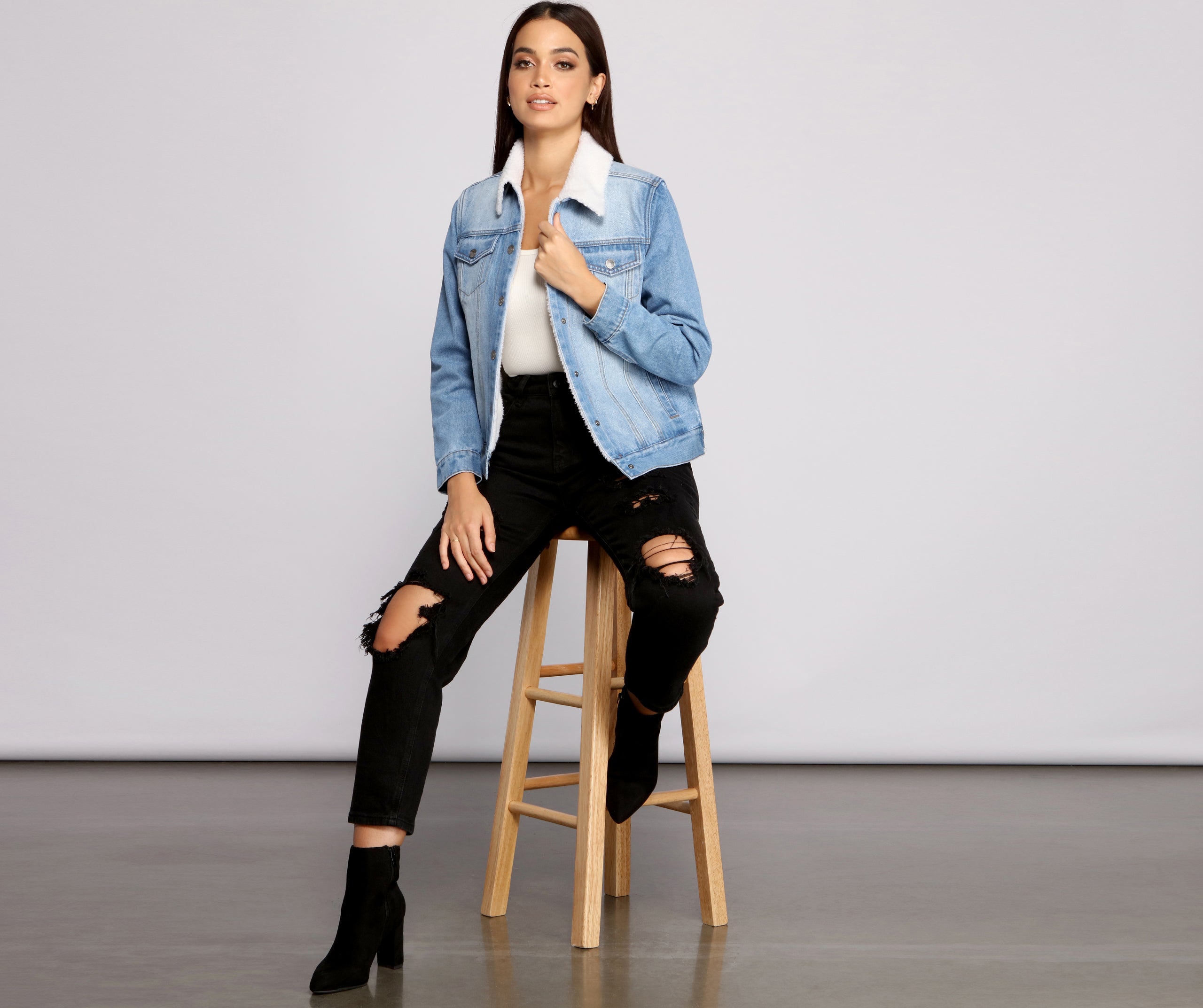 Layer up. bby! This denim jacket is perfect to chase those winter blues away. The jacket features a collared neckline. long sleeves. multi snap button front closure. two chest pockets. side pockets. soft to the touch sherpa hood. and a cozy sherpa knit lining. The jacket features a relaxed fit with minimal stretch. Style with a and skinny leg jeans.