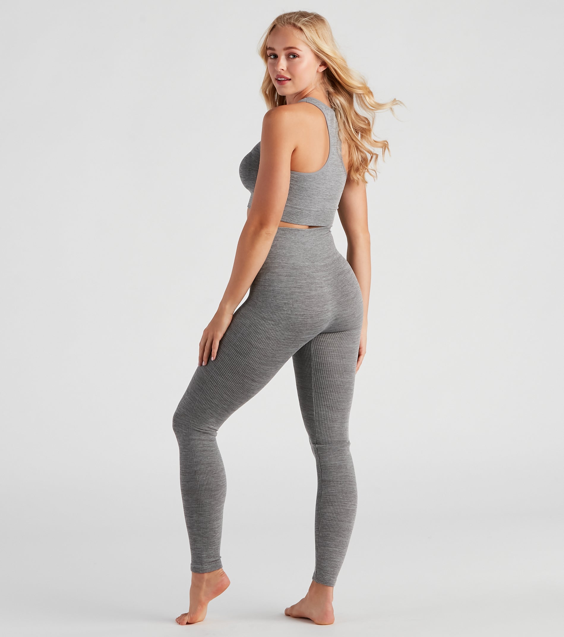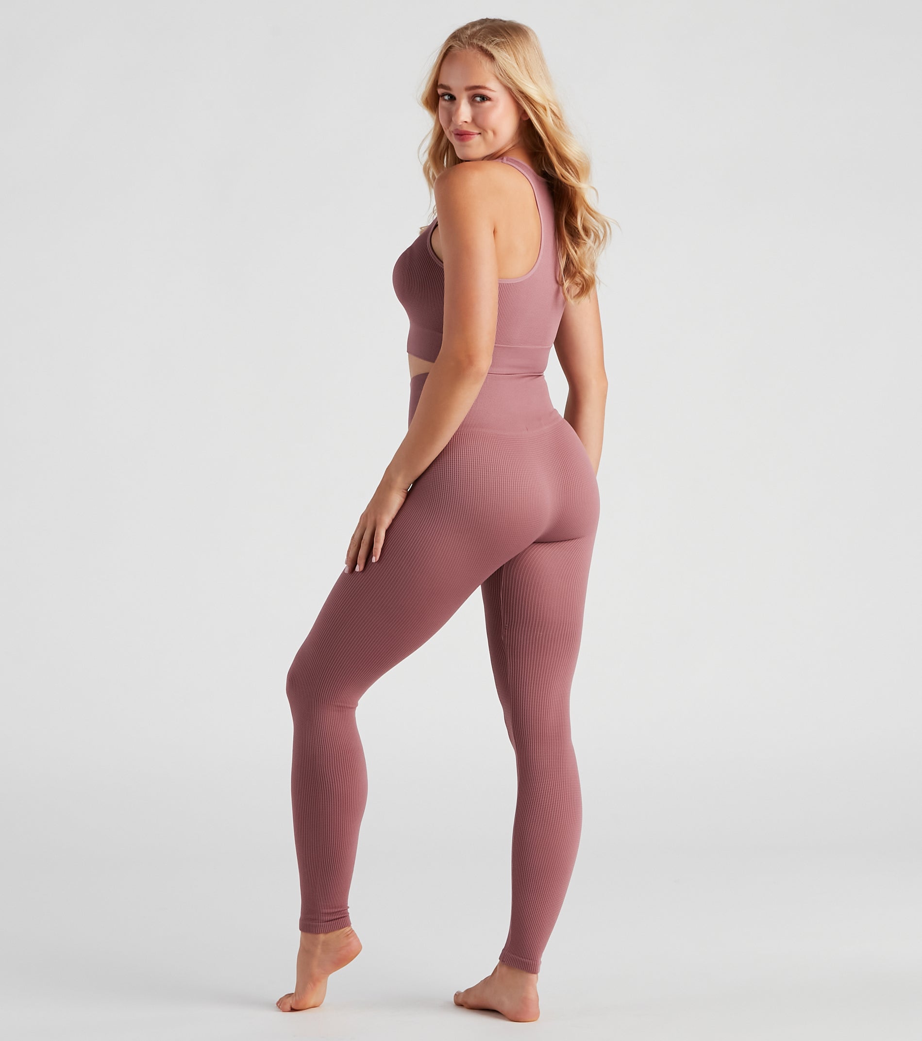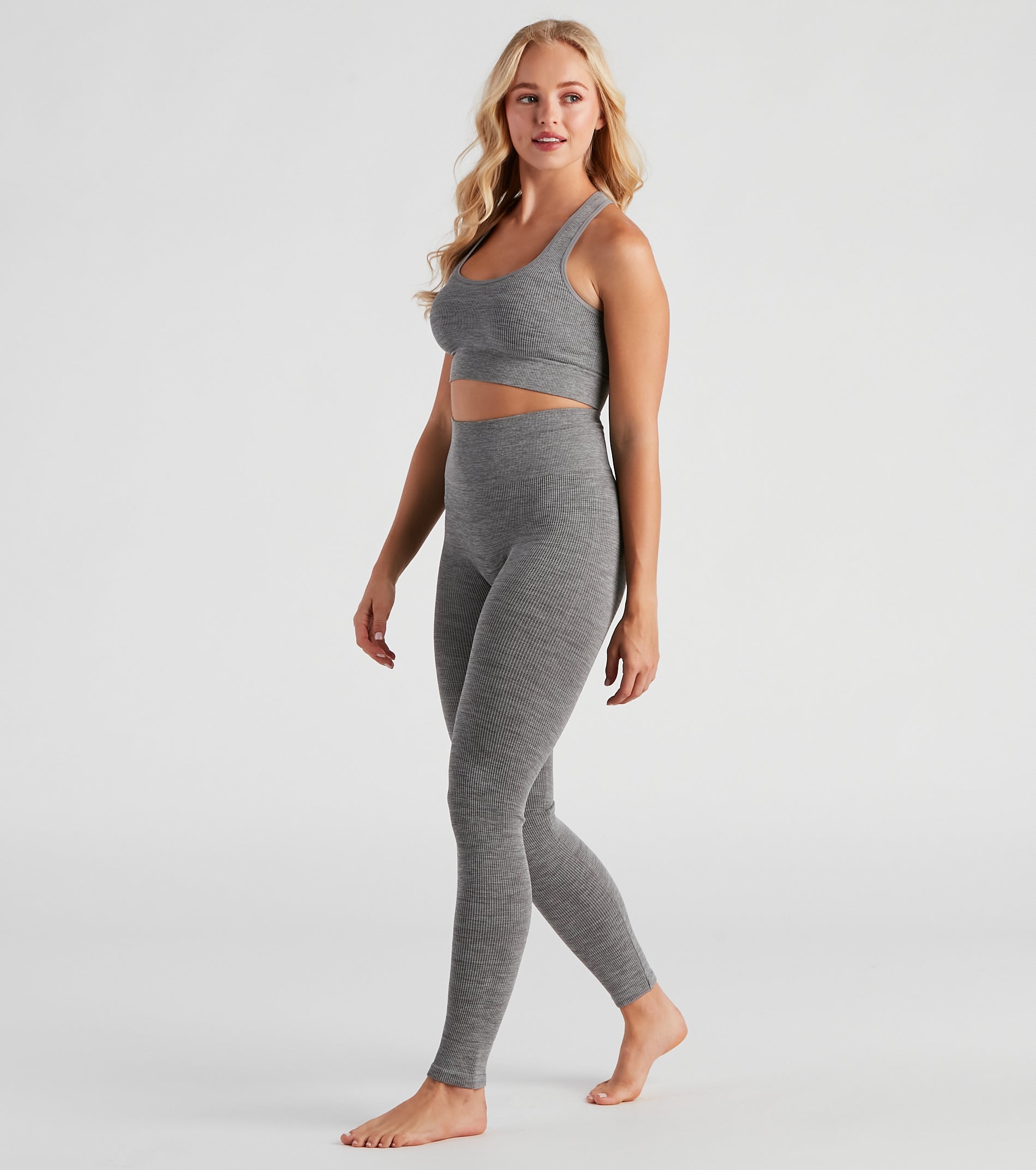 Cozy up for a movie night in this cute pajama top and leggings set! The sleeveless top features a scoop neckline with a racerback design and a fitted cropped hem. The matching leggings feature a high-rise waist with a form-hugging fit throughout the leg. The stretchy knit fabric has a?chic seamless look. Style this set with a .