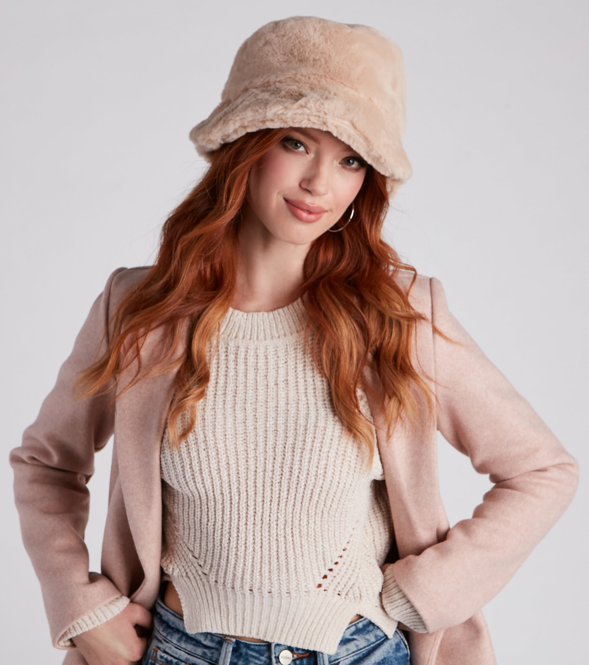 Cute and cozy. this faux fur bucket hat is a winter staple! It features a short brim and a super soft faux fur material. Style with a ?for a city stroll!