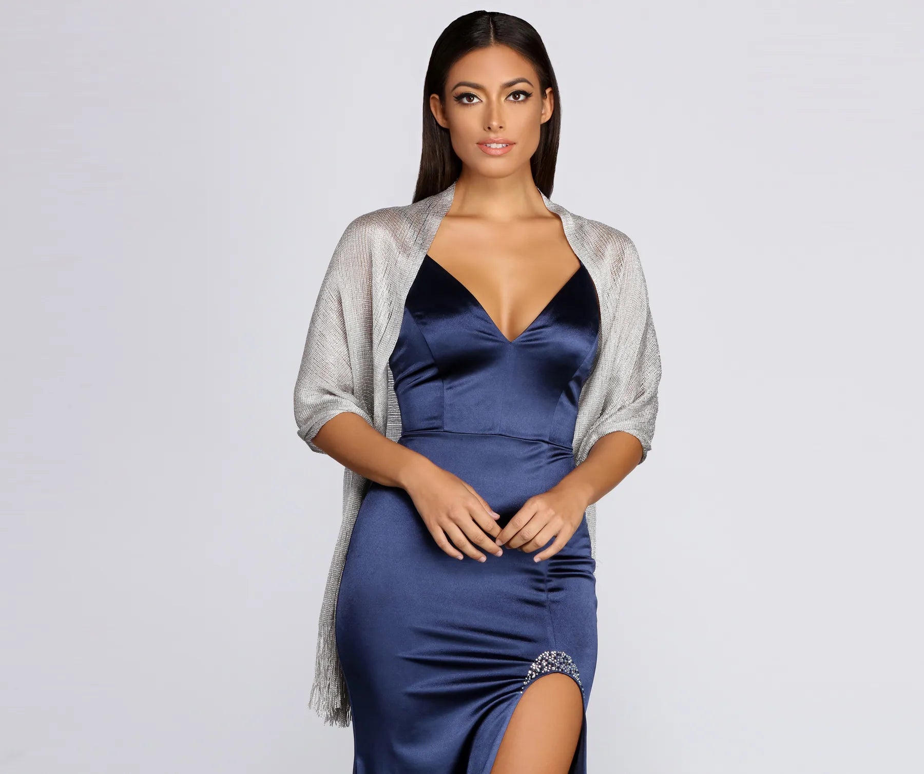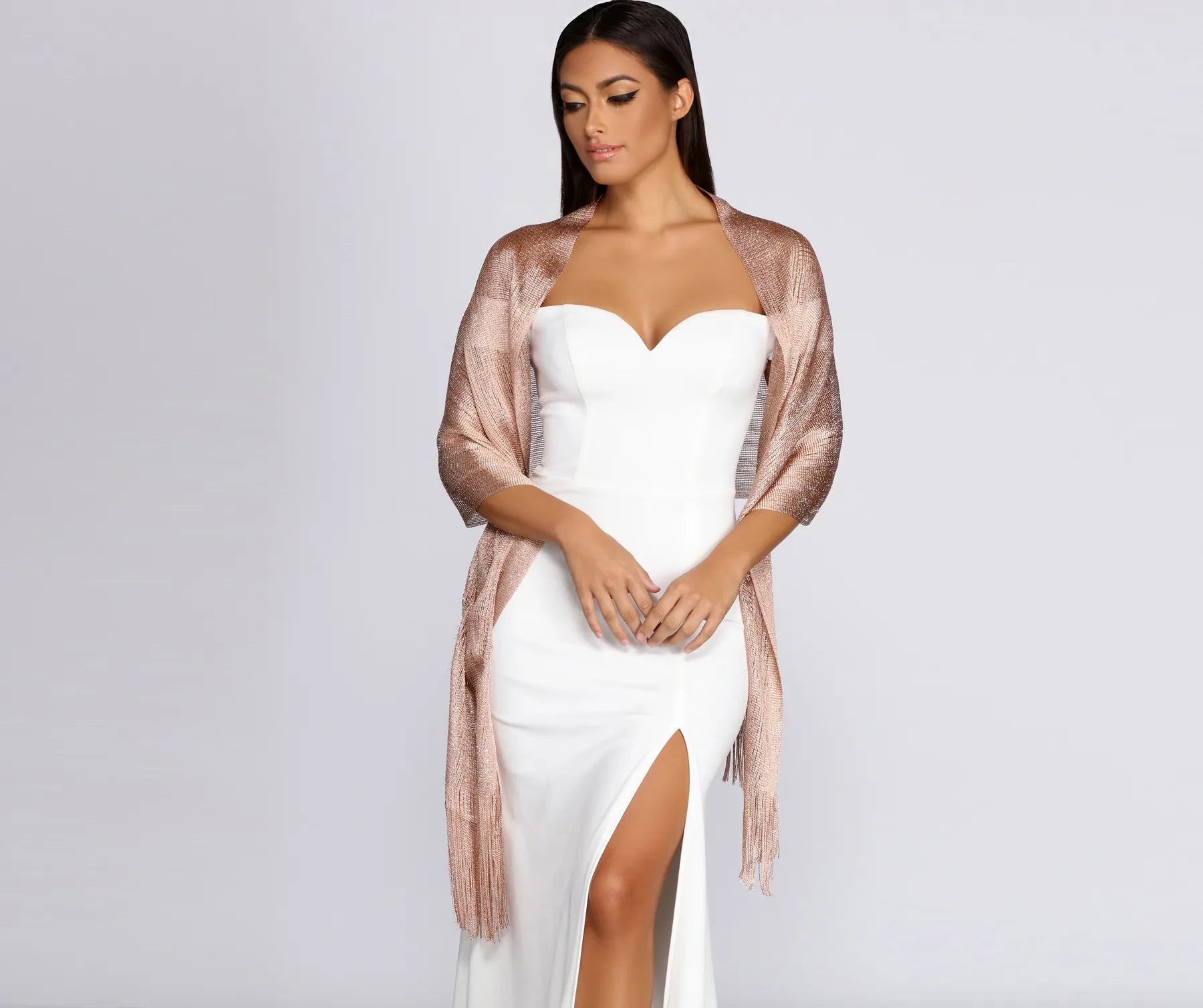 Keep it timelessly elegant with a this luxe inspired shawl! It features a metallic crochet design and a fringed hem. Shawl is composed of a lightweight crochet knit fabric.