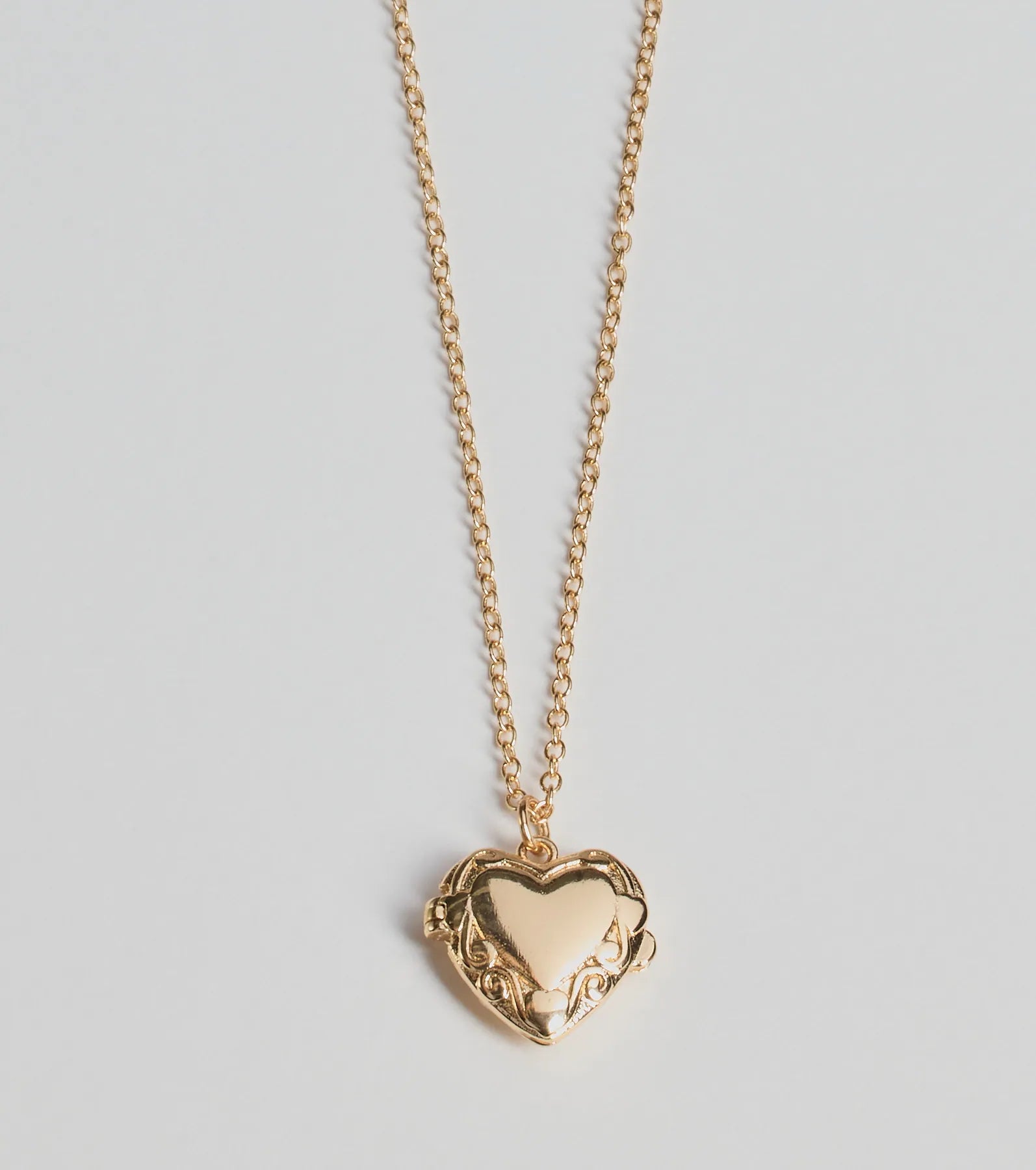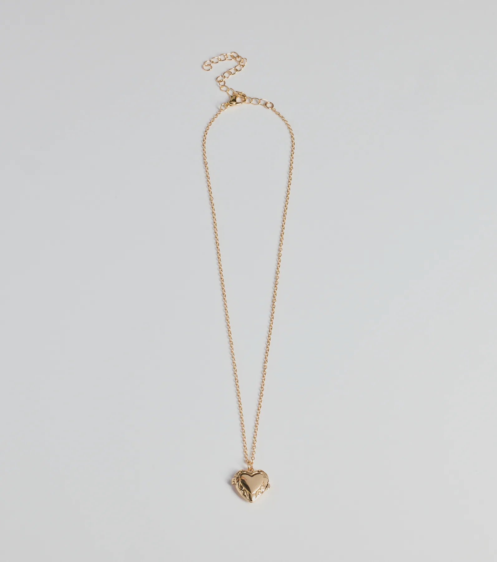 Stun in a necklace that features a dainty chain and an etched heart pendant. Complete with a drop-waist dress and flat shoes.