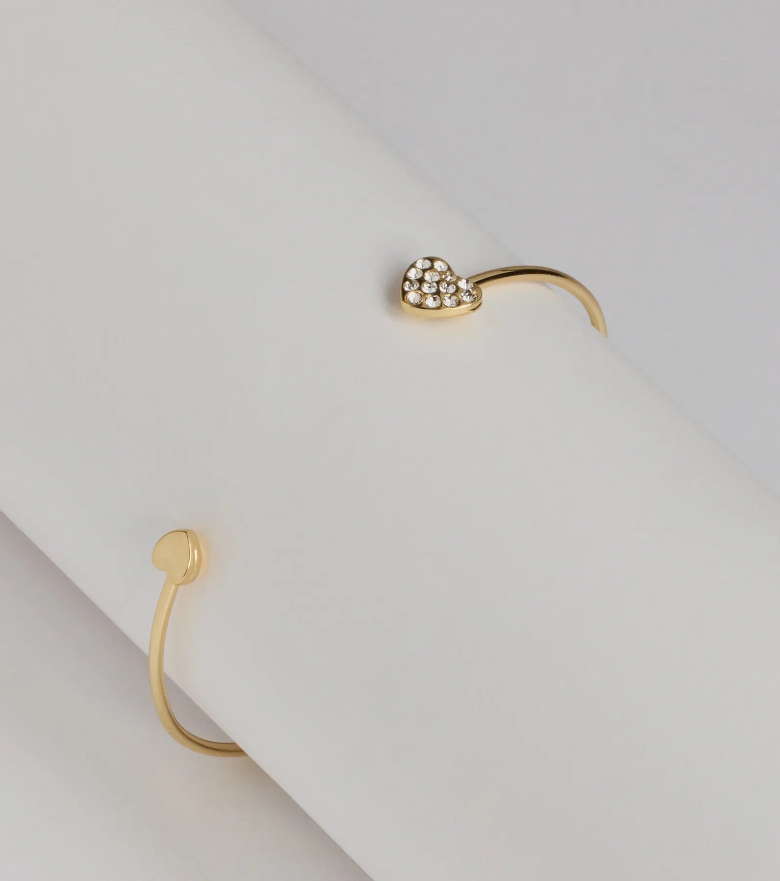 A bangle bracelet adorned with delicate hearts with one showcasing mini rhinestones for a hint of glam.?