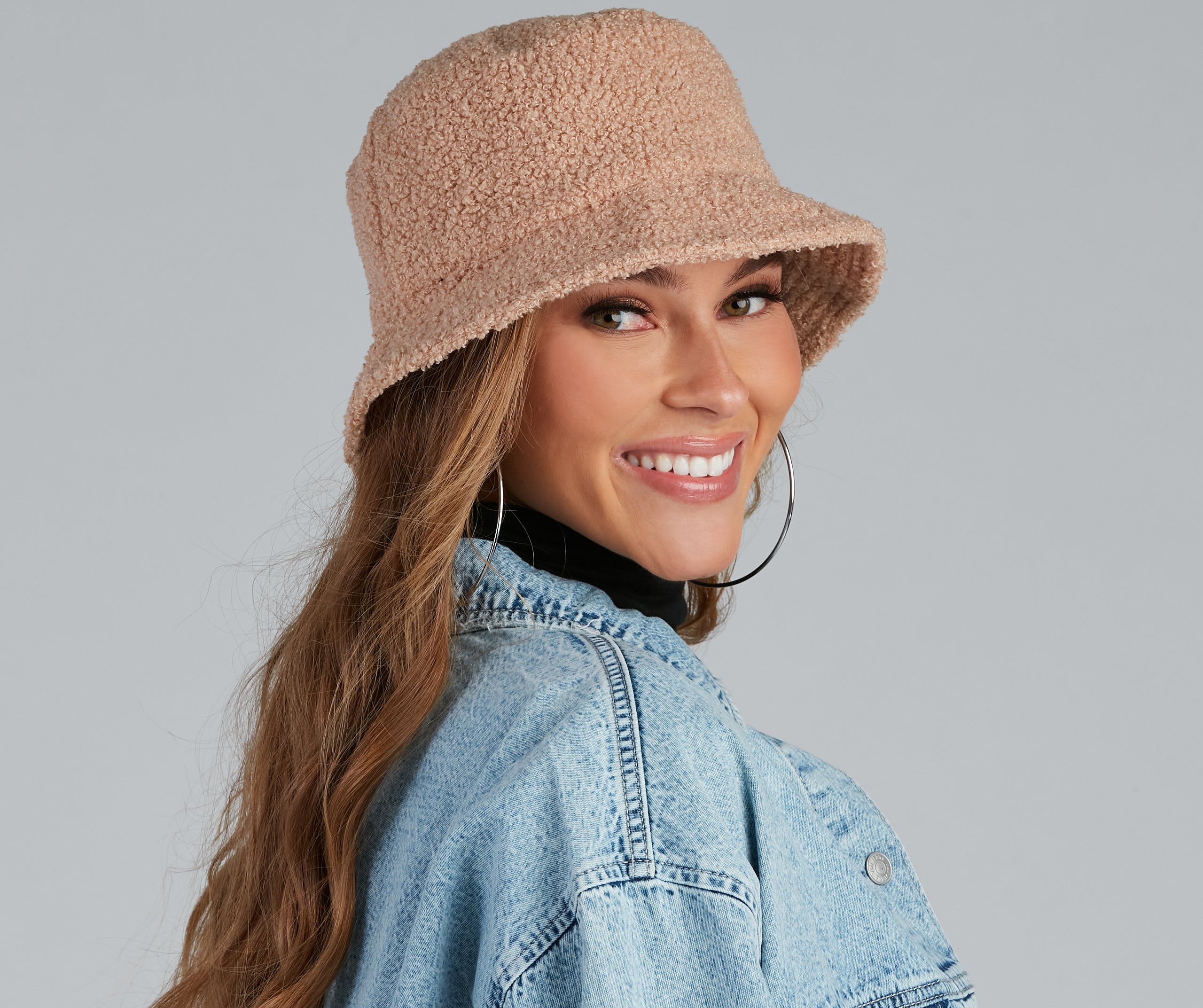Look cuddly and cute in this faux sherpa bucket hat perf for cold days! Complete the look in a comfy