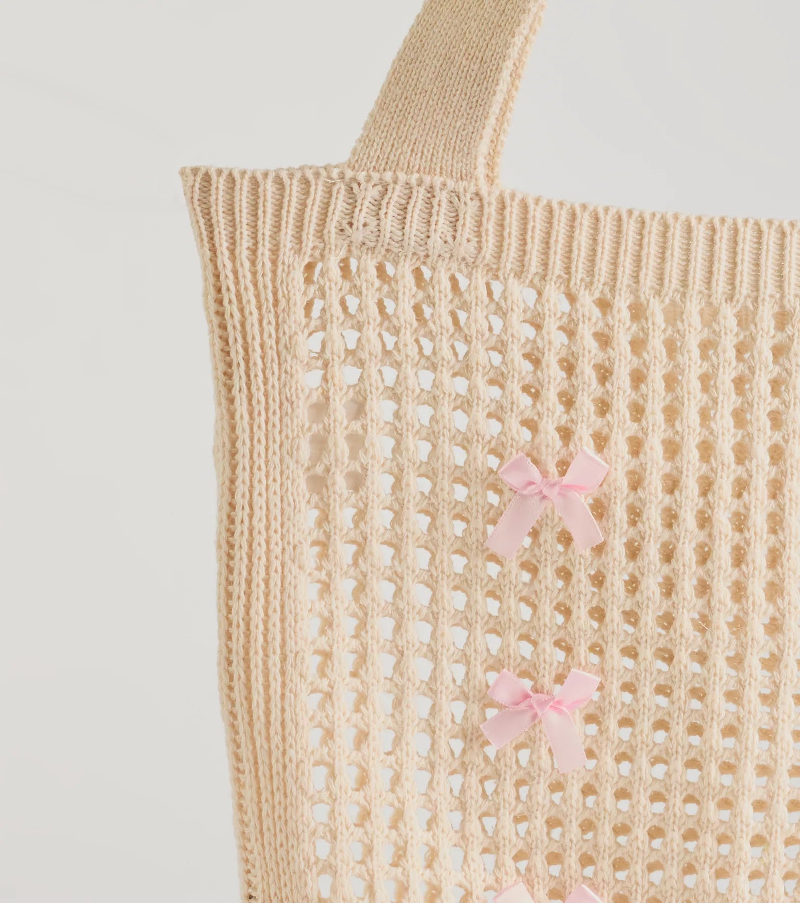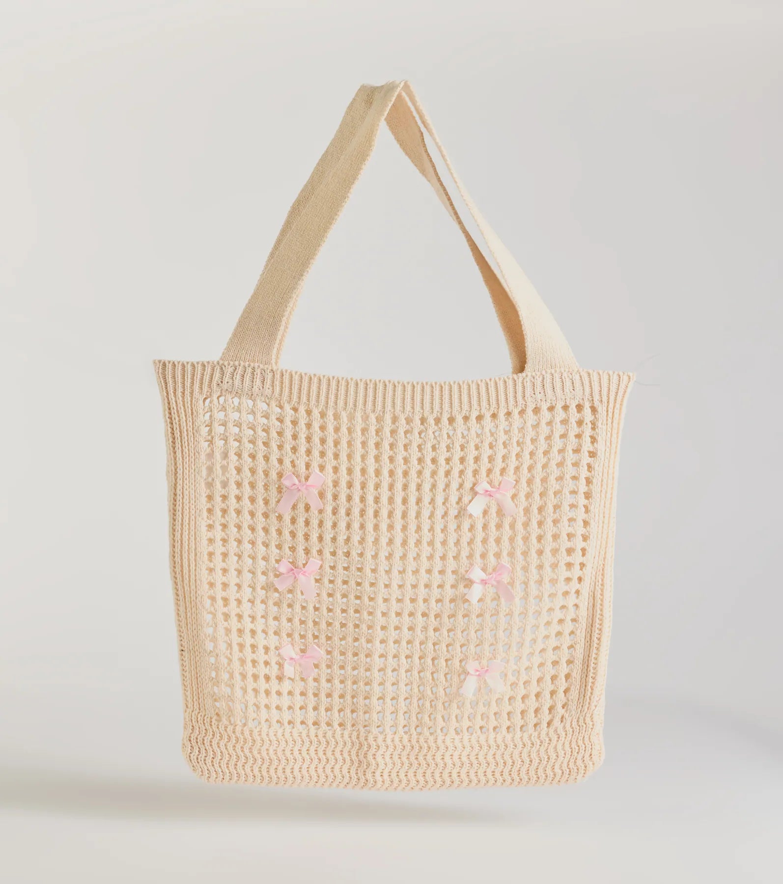 A crochet tote bag that features top handles. satin bow decorations. and a spacious interior perfect for carrying your essentials in.