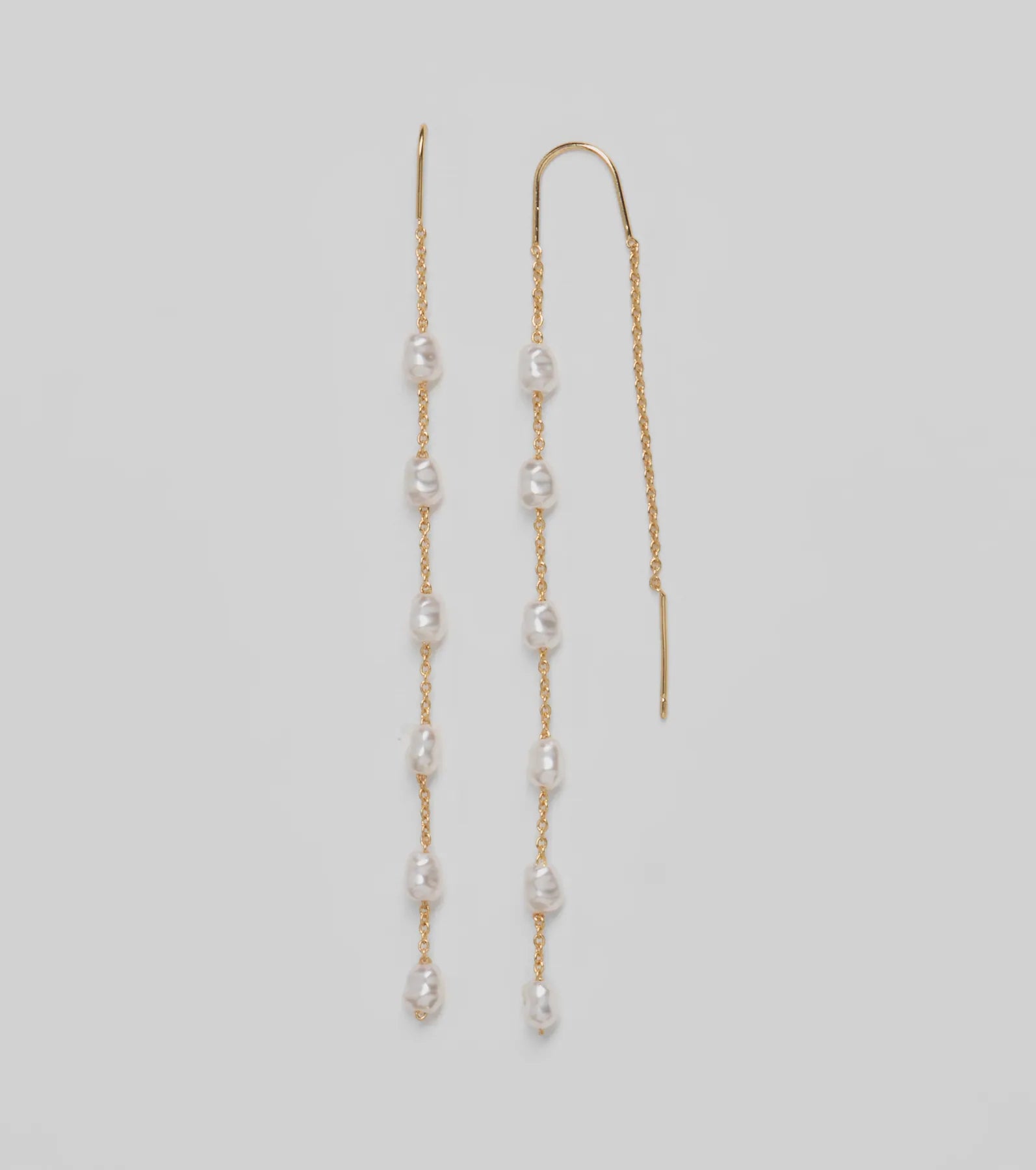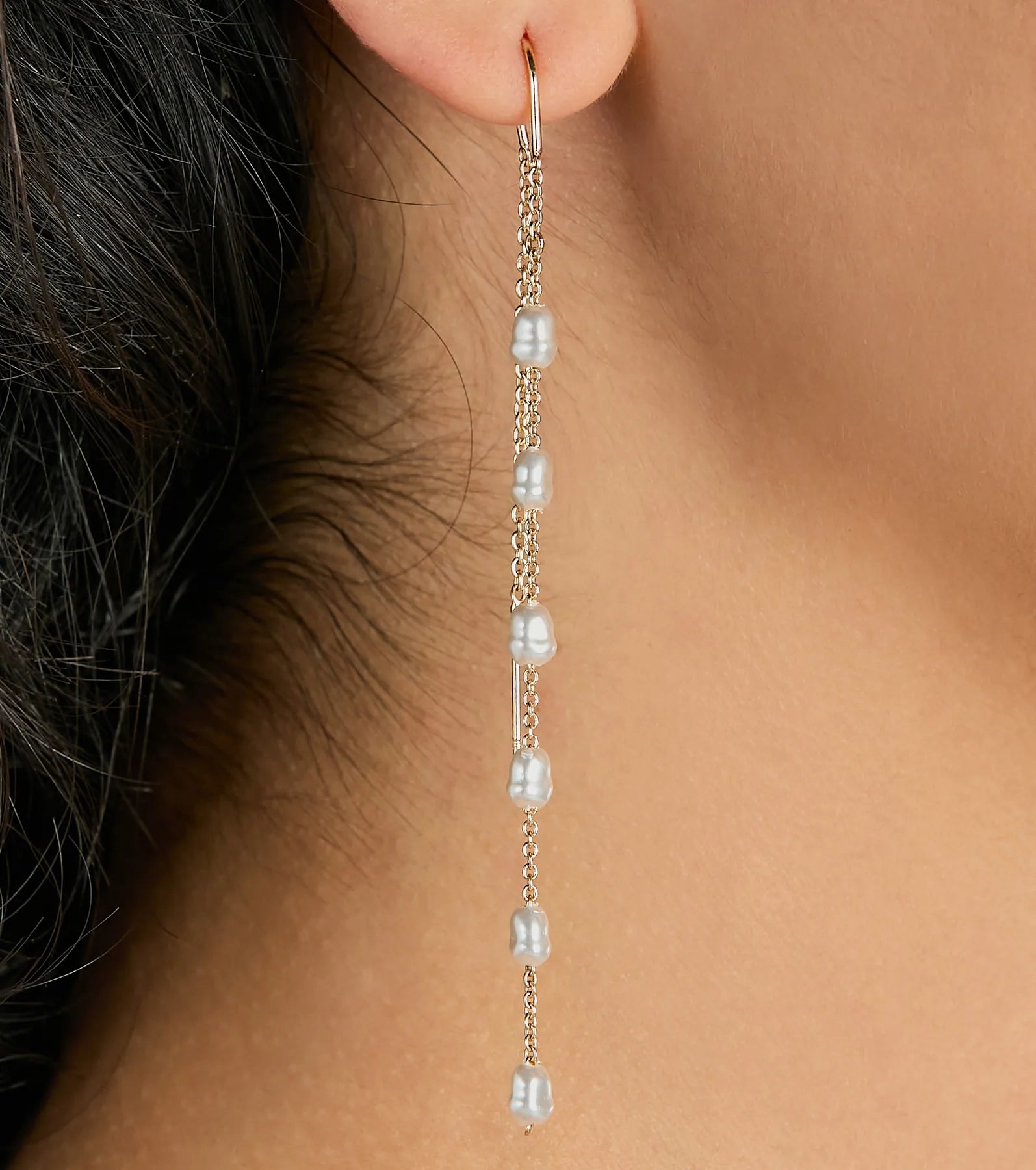 So dainty chic. these pearl chain threader earrings are the perf accessory for elevating your look! They feature a long threader design with a thin chain. small faux pearl details. and a thin bar accent at the end. Style with a !