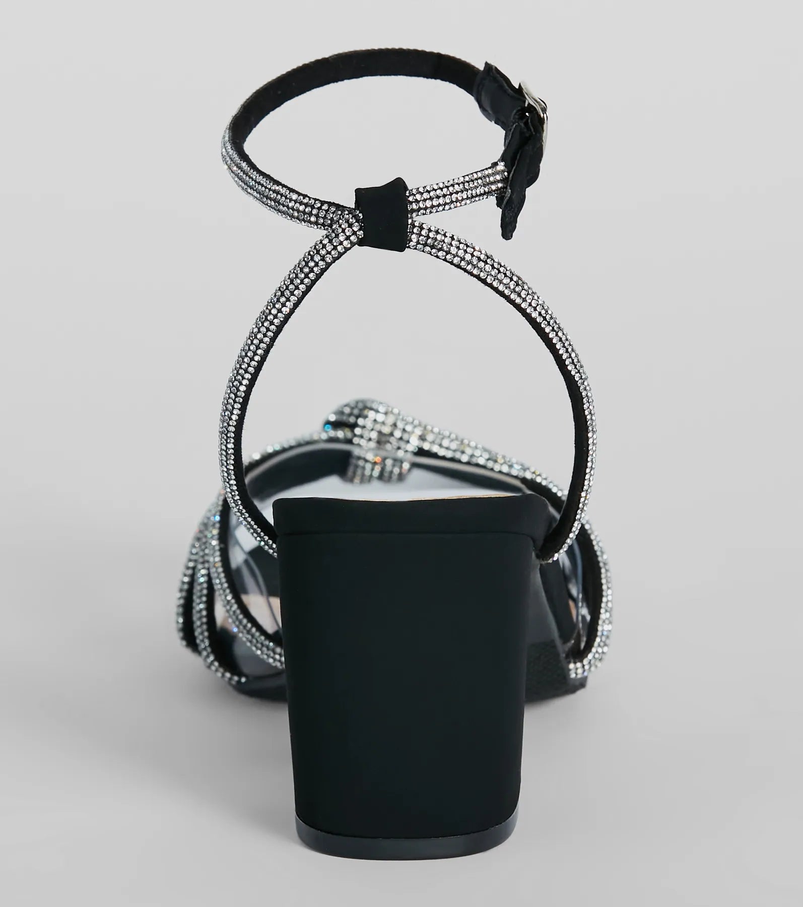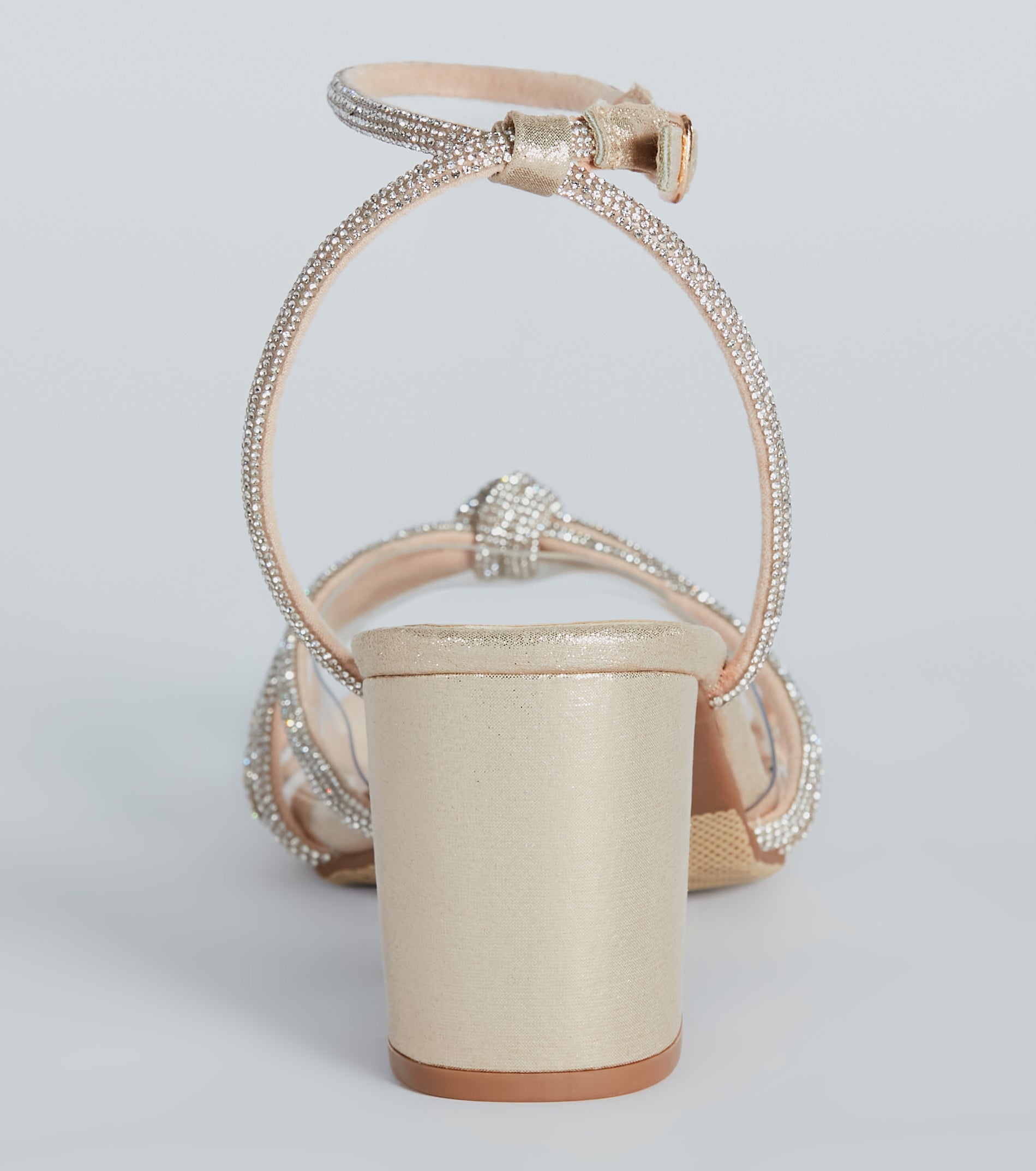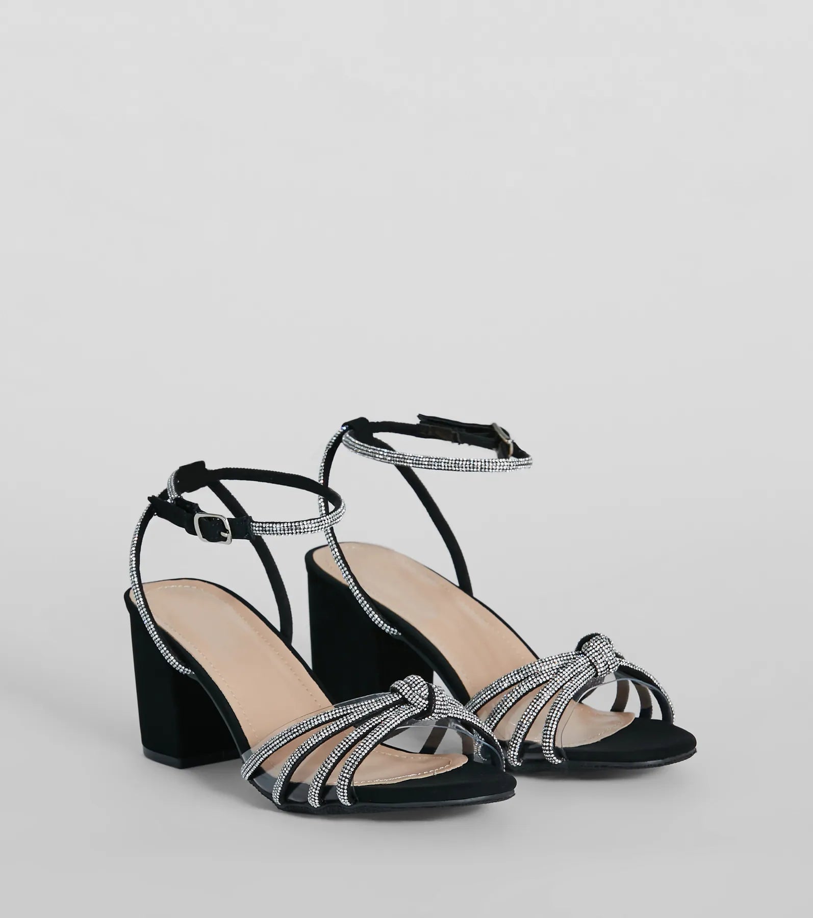 Put on your dancing shoes aka these gorgeous block heels for a night of twirling! They feature an open almond-shaped toe. a strappy rhinestone-embellished foot strap with a knot accent. a short block heel. an adjustable rhinestone trim ankle strap with a buckle closure. and a metallic sheen. Complete the look with a sparkly for a dressy or formal soiree!