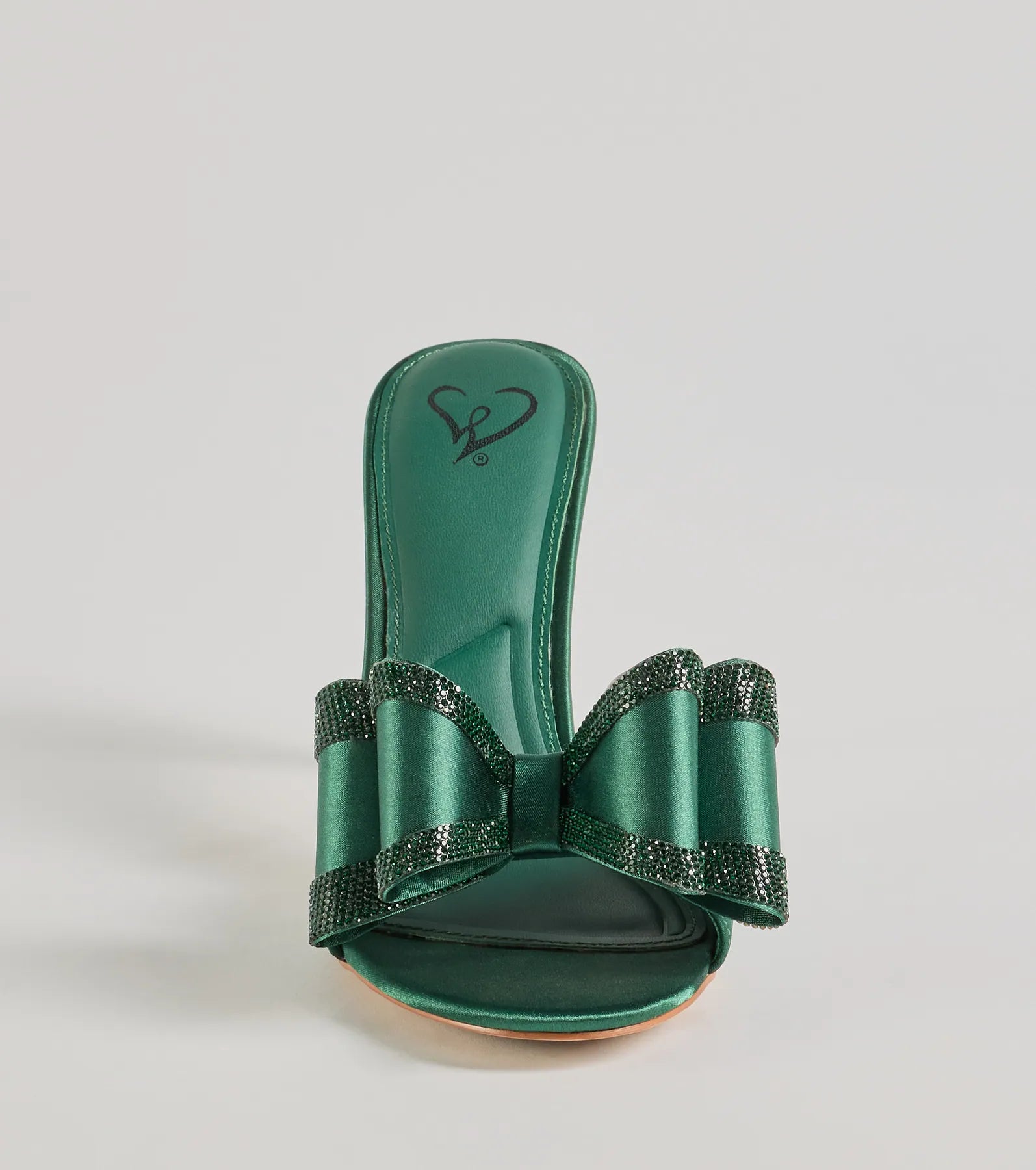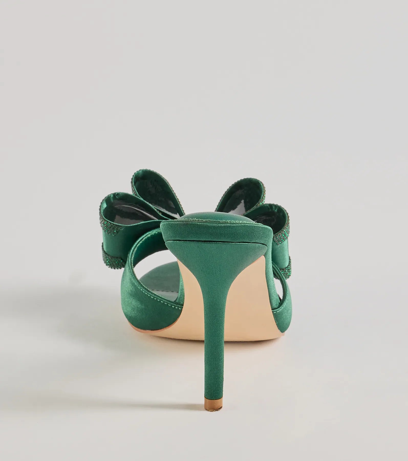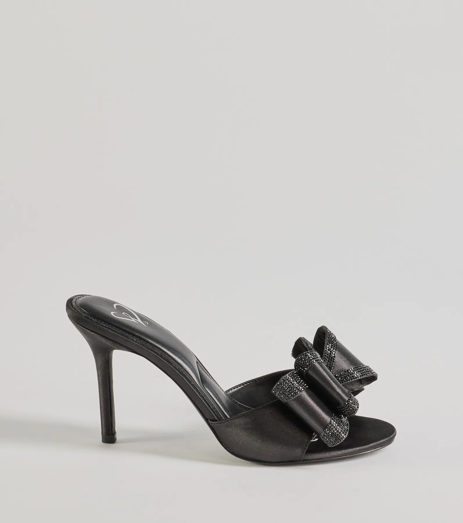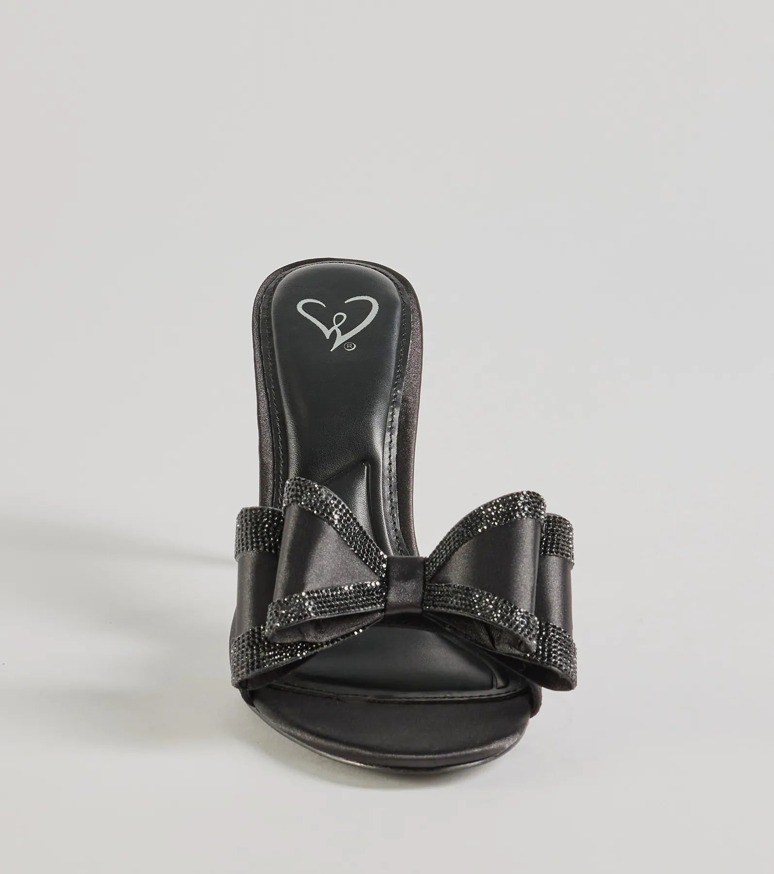 - Large bow accent with rhinestone trim