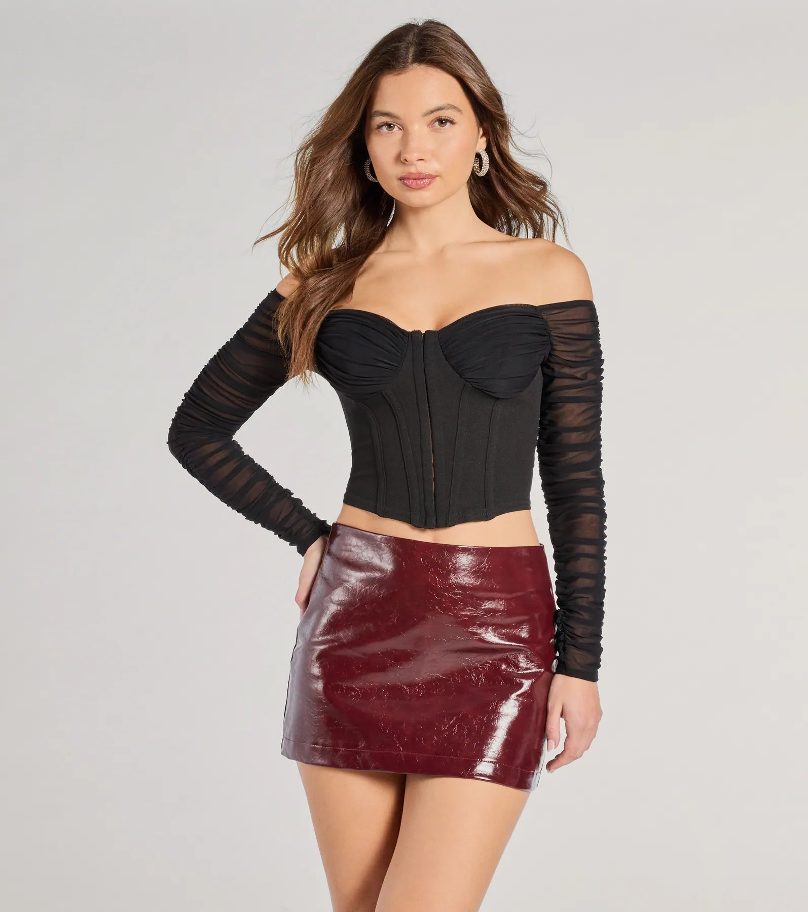 Keep it fierce in this long sleeve mesh bustier top. With sheer sleeves. a sweetheart neckline. and a cropped hem. this top is your go-to for turning heads and owning the night.