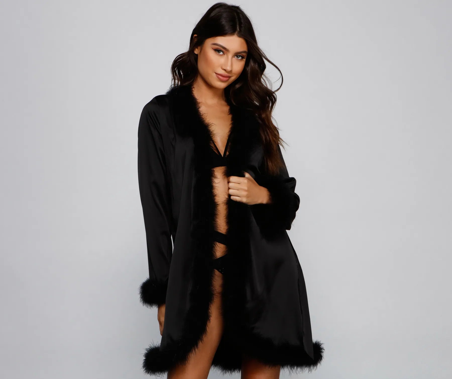 Steal his heart in this dreamy satin robe for a sultry night in! It features long sleeves. an open front with belted waist tie. and a marabou feather trim throughout. Complete the look in a sexy set.