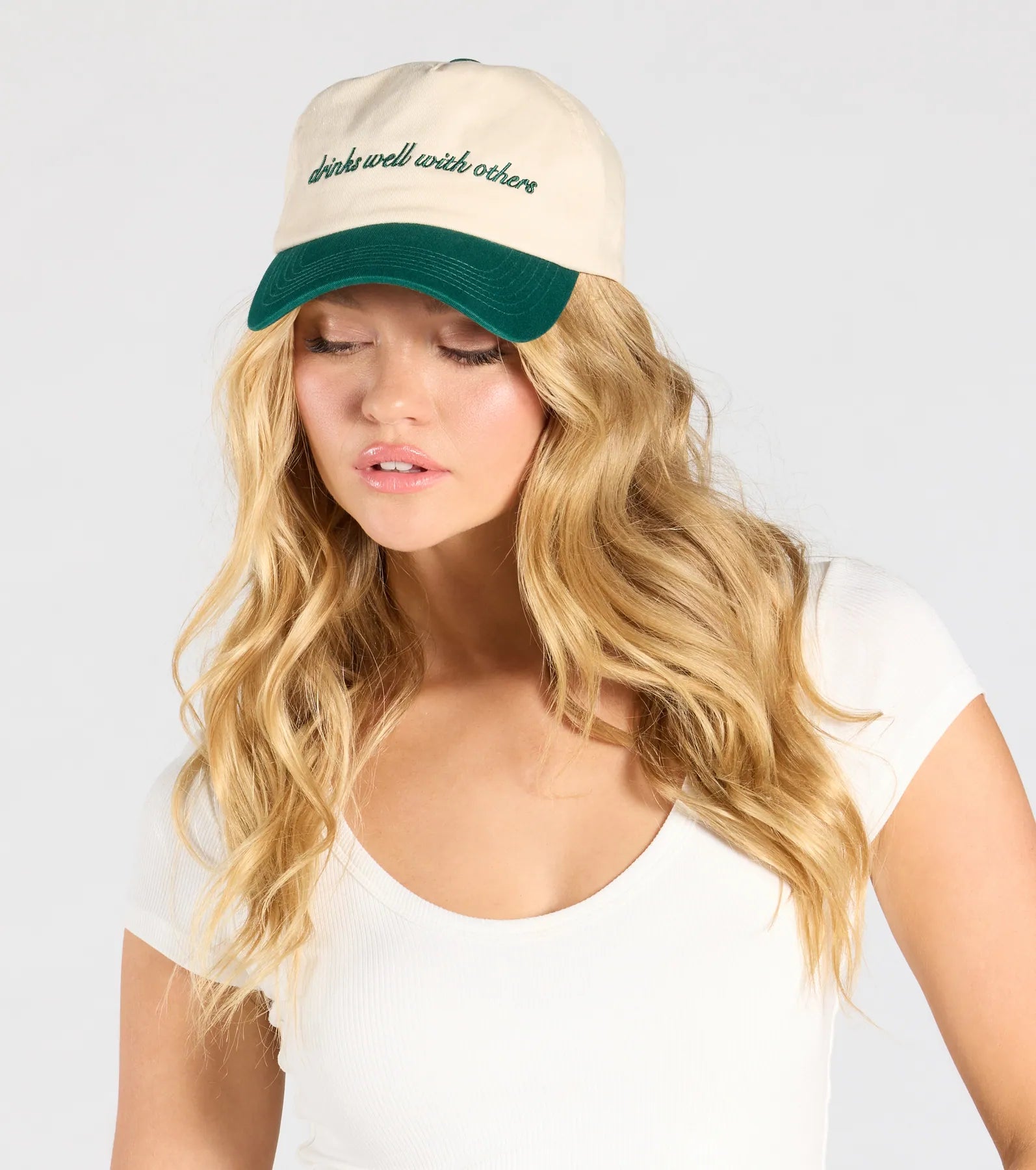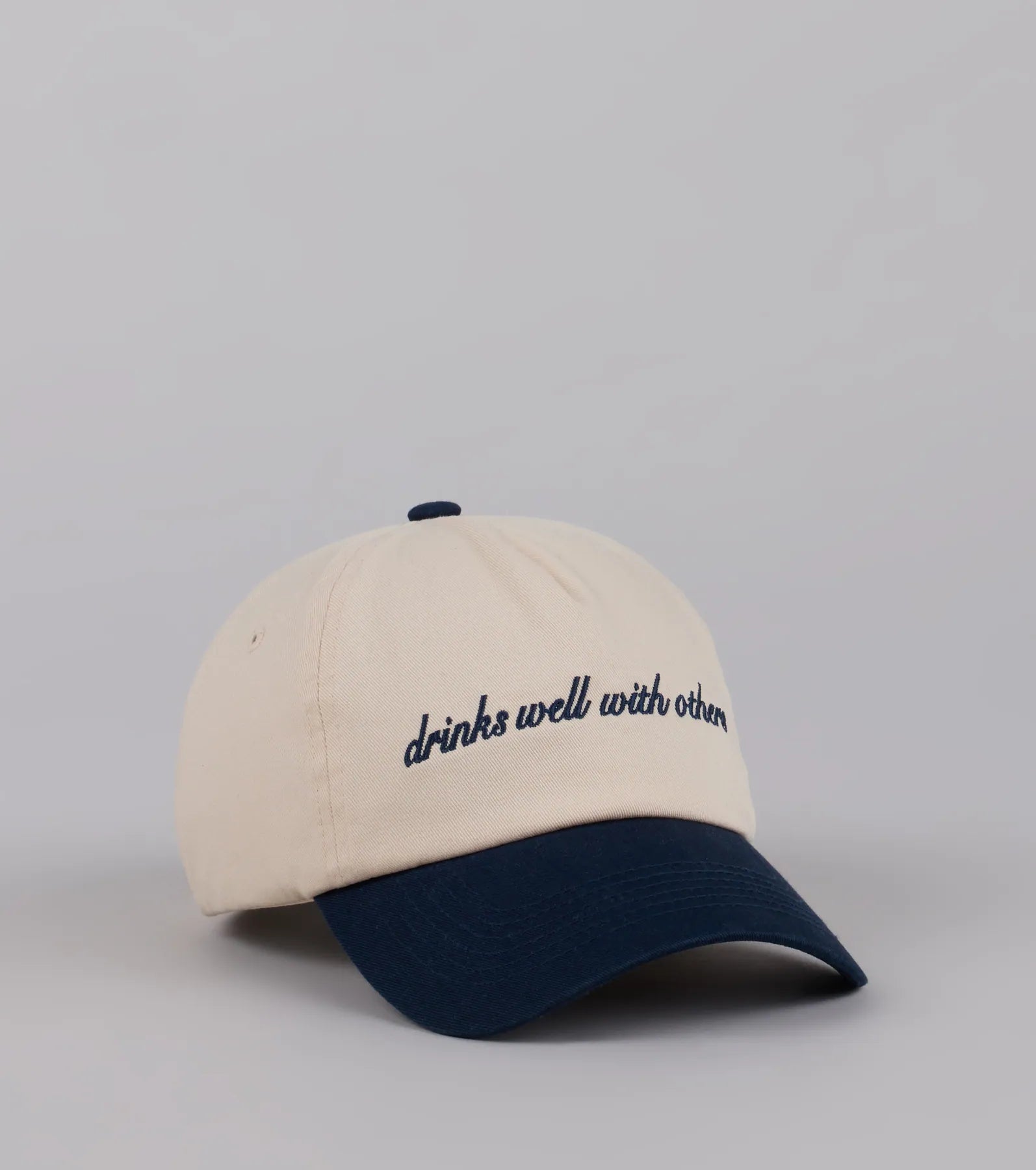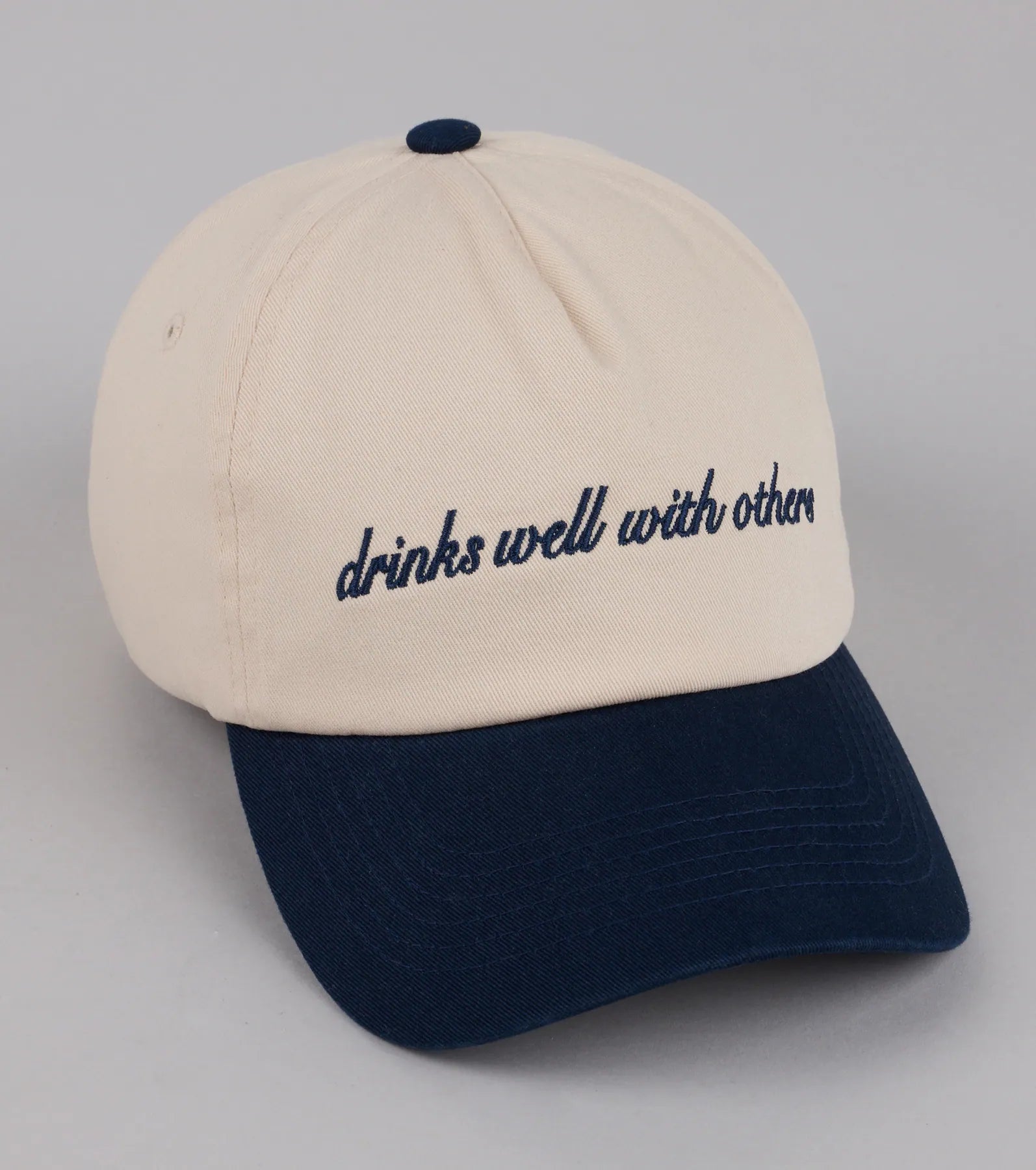 A cute baseball cap with attitude! This two-tone hat features an embroidered Drinks Well With Others and an adjustable back strap to get the perfect fit.