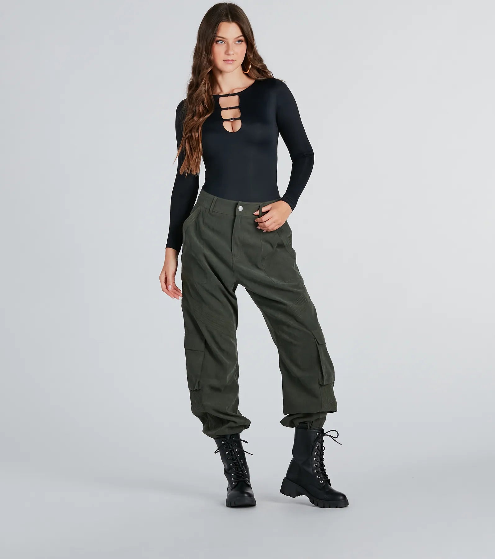 Your style always makes an edgy image. so let this knit bodysuit do the same for you! It features fitted long sleeves. a crew neckline. a front gold trim cutout. a form-hugging fit. and a thong bottom with snap-button closures. Complete the look in a and boots!