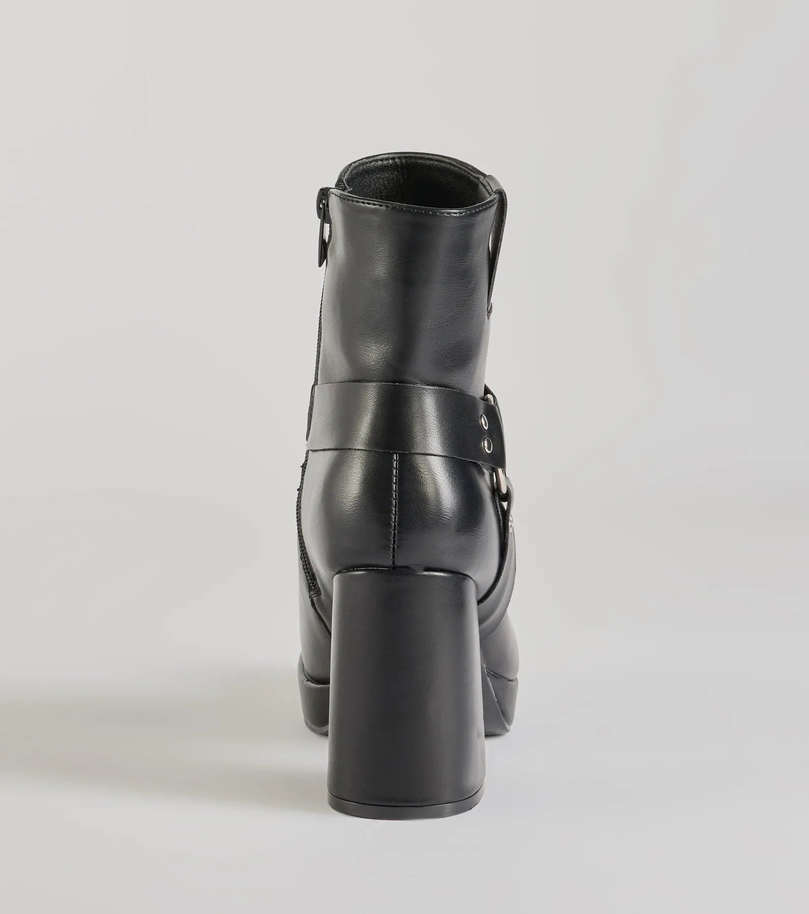 A pair of moto faux leather booties featuring a sleek square toe. a platform sole to elevate the style. a block heel. and a trendy side hoop strap design. Perfect for styling with a jacket.