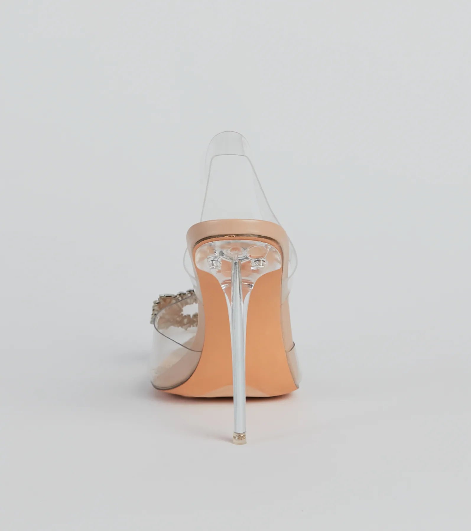 Step up your luxe formal attire with these elegant stiletto heels for upcoming fancy soirees! They feature a sleek PVC clear pointed closed toe with a gorgeous rhinestone brooch. a clear lucite heel. a clear ankle strap. and a cushioned faux leather footbed. Complete the look with a for the perfect finish!