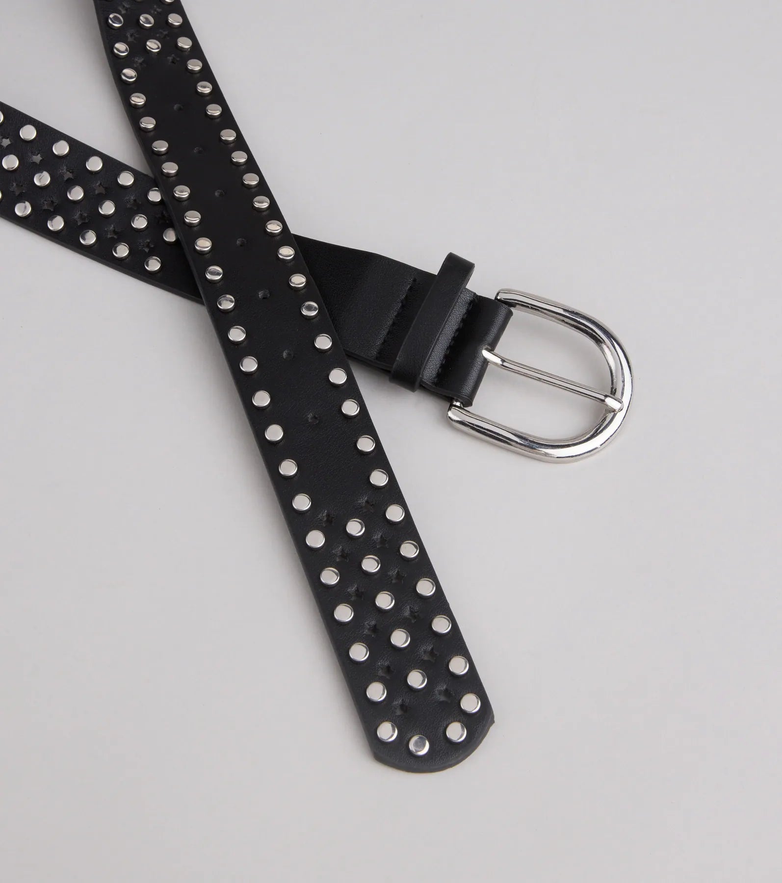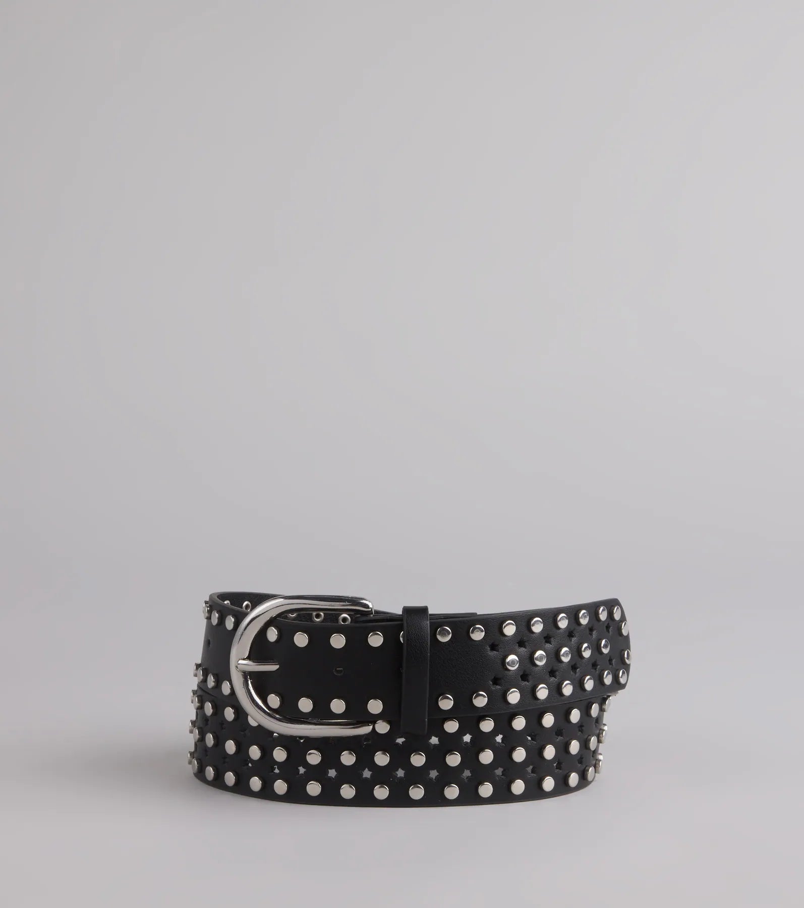 Elevate your casual looks with this edgy faux leather belt featuring a studded trim design for that cool-girl vibe.