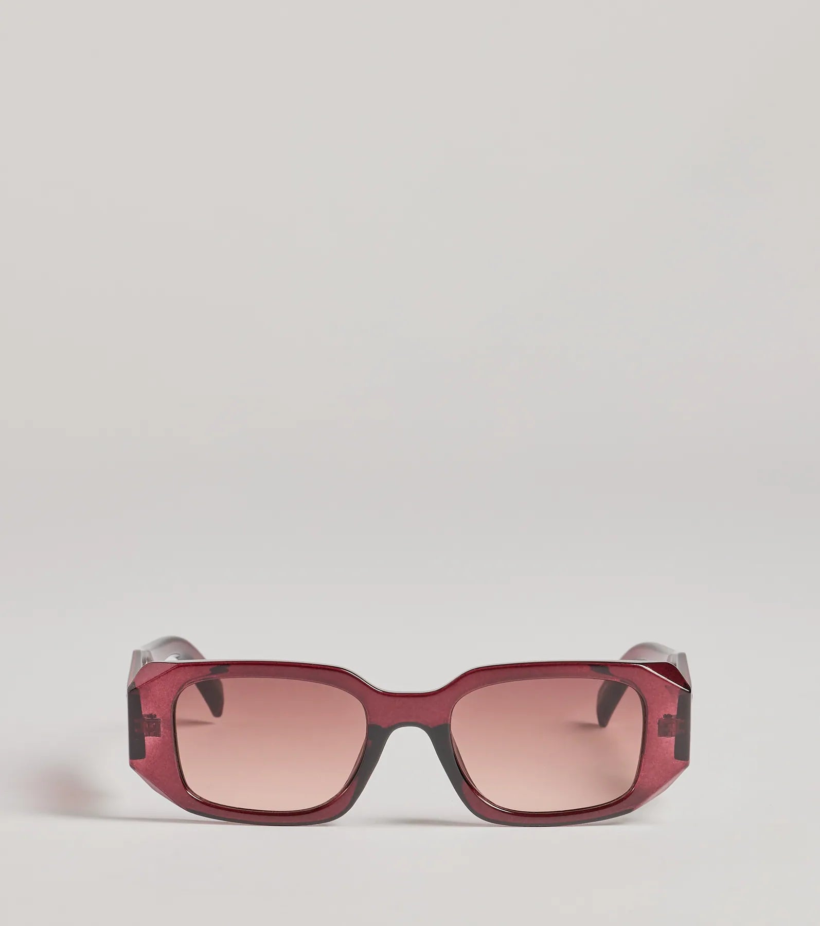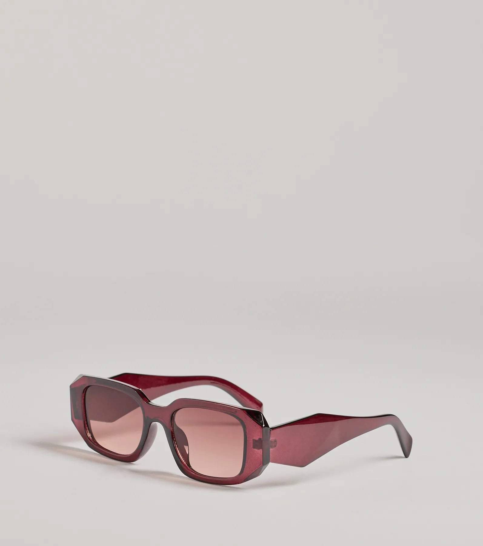Elevate your look in these rectangle sunglasses made with tinted lenses that provide UV protection and built-in nose pads for comfort. Style with a handbag.