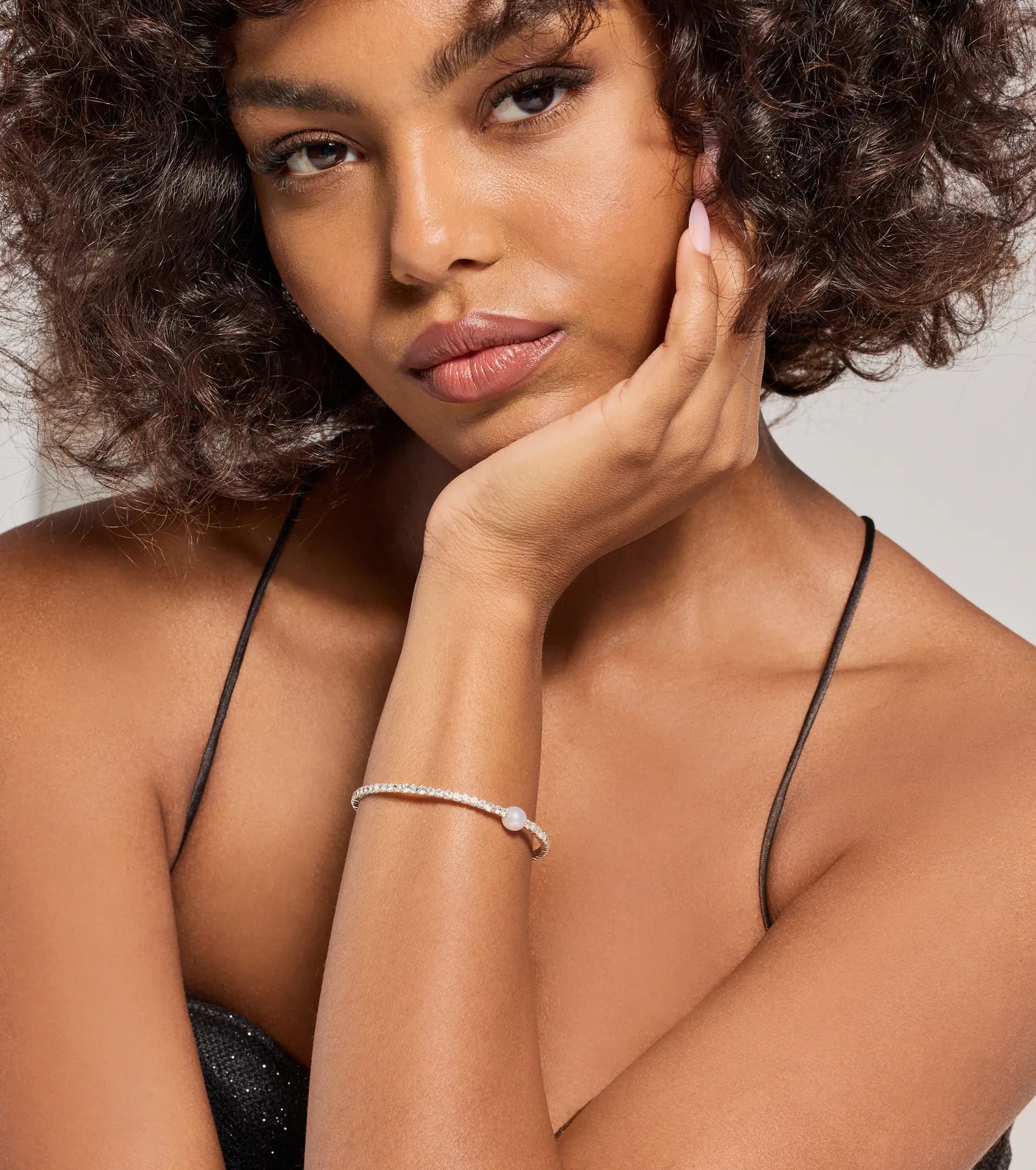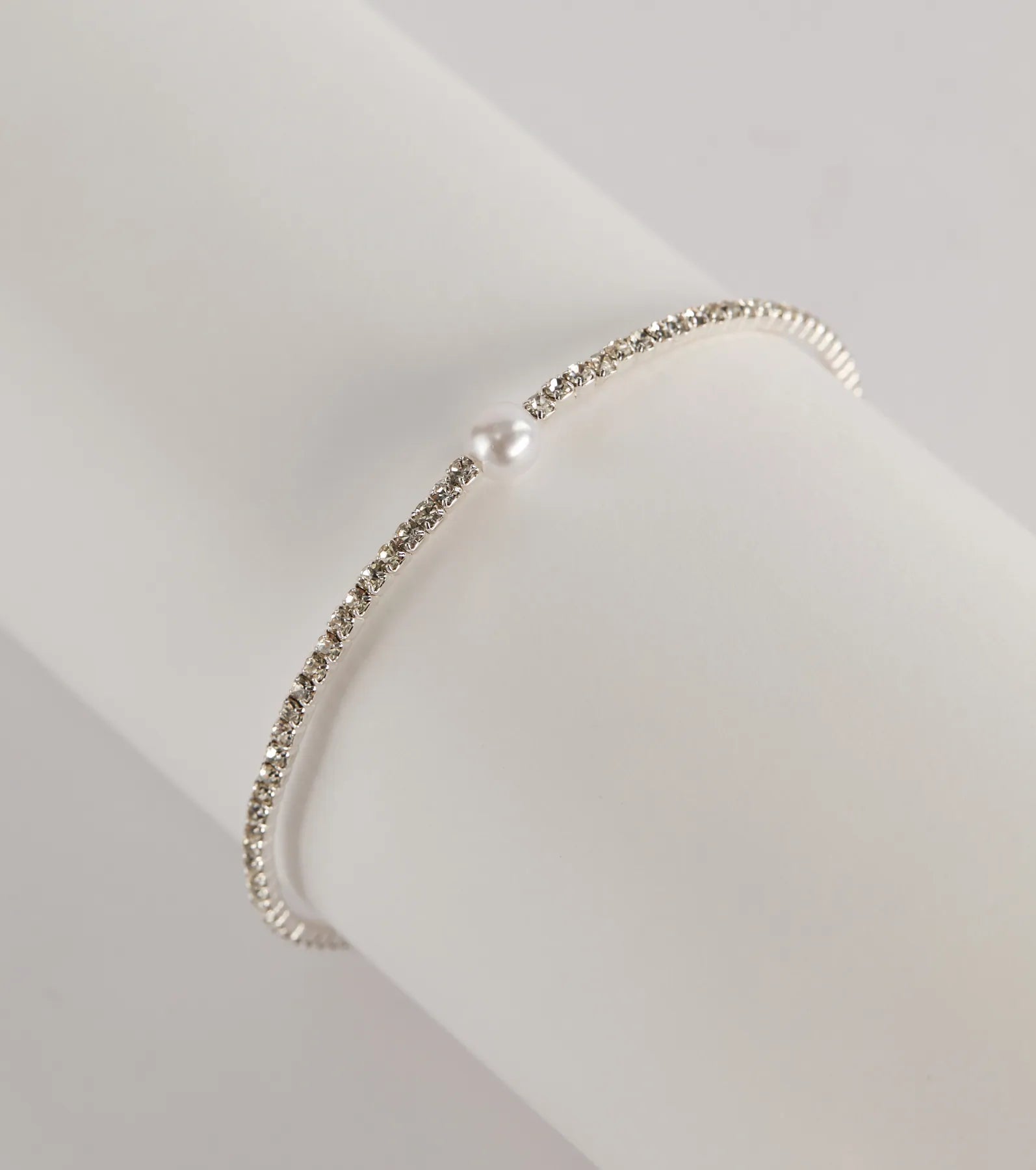 An elevated bracelet featuring a rhinestone embellished memory wire with a faux pearl accent. Perfect for styling with a semi-formal or cocktail dress.?
