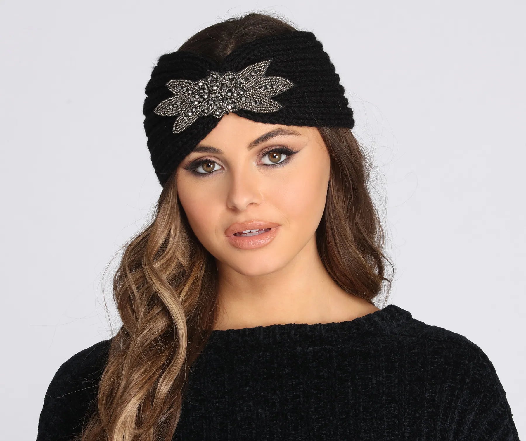 Sparkle like the snow this season with an embellished head-wrap! It features a large front decoration with a cluster of beads. silver stones. Head-wrap is composed of a stretchy cable knit material.?
