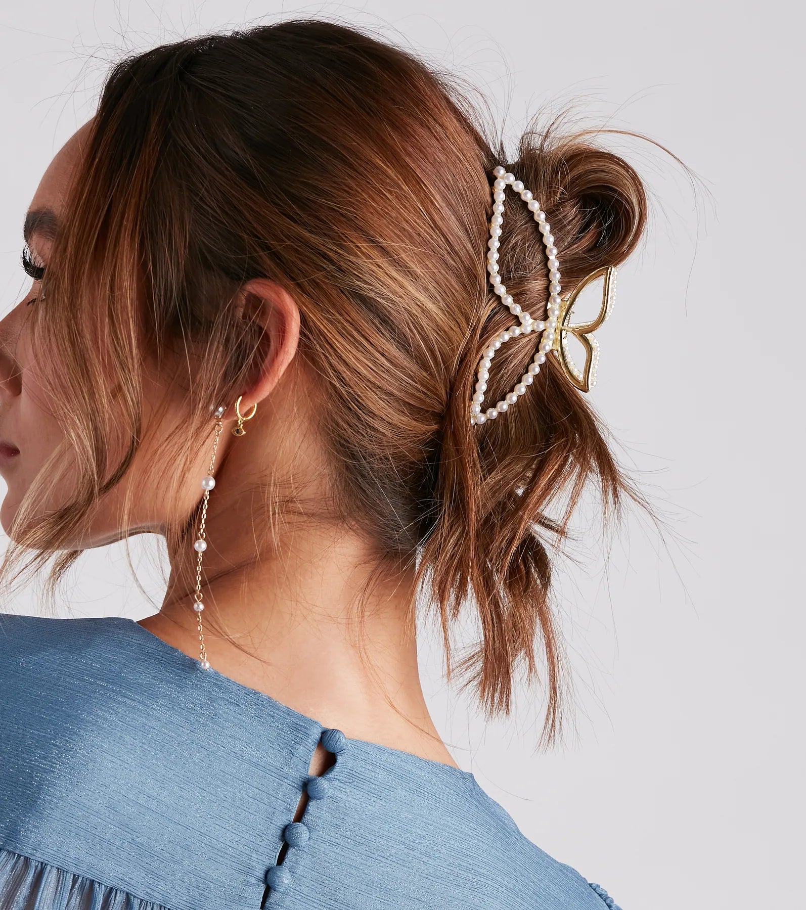 Style up your pretty tresses with an enchanting and chic hair clip! It features a claw clip design in a trendy butterfly shape with faux pearl embellishments. Pair with dainty for a gorgeous look.