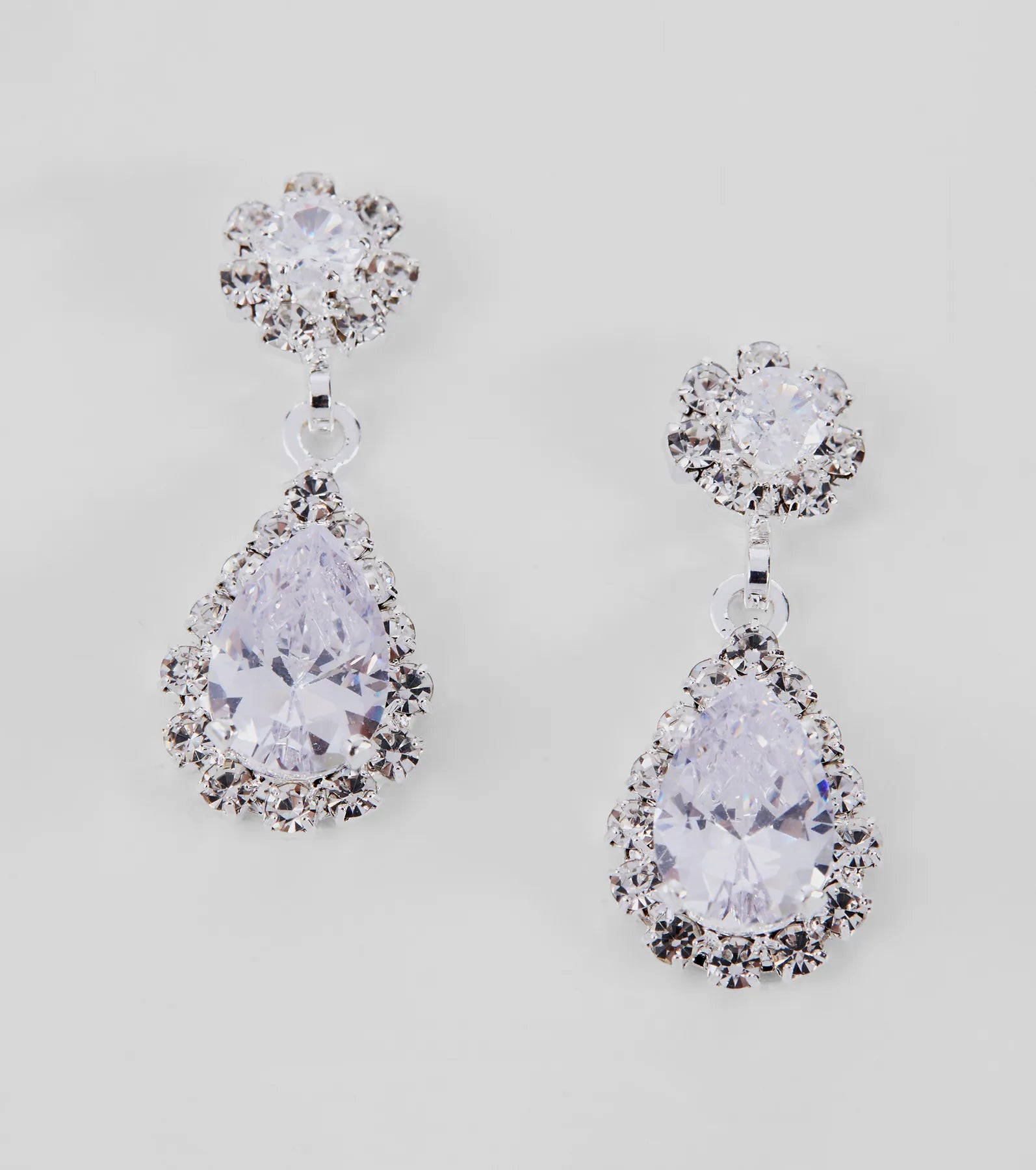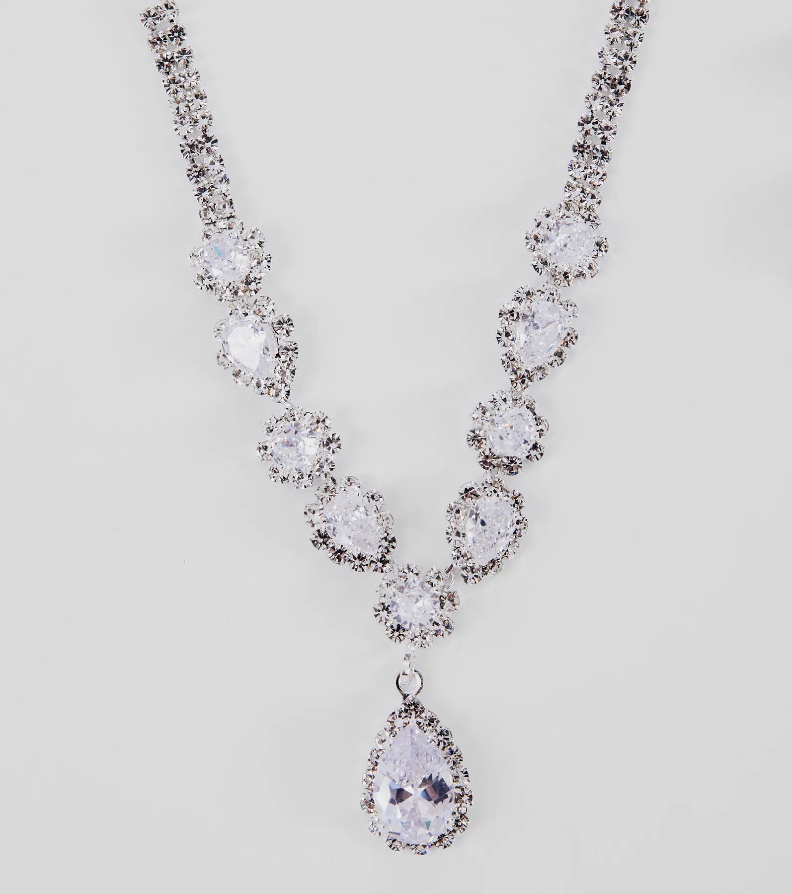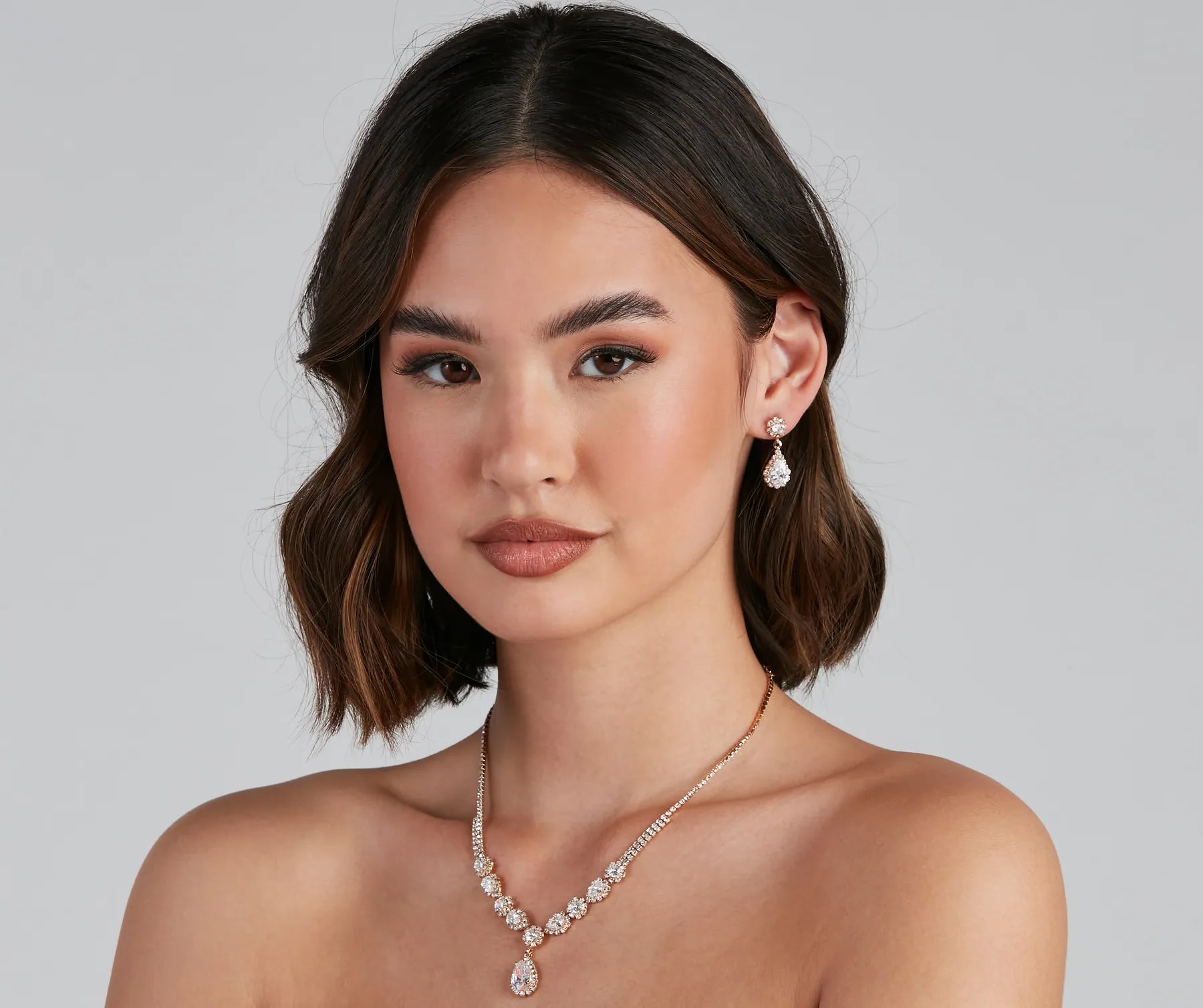 Embrace a glam look with a collar and earrings set! The set includes a V-shaped collar necklace adorned with a teardrop-shaped gemstone at the center and mini rhinestones. The matching earrings feature a teardrop-shaped design and post-back closure. Complete the look with a and sleek stilettos.
