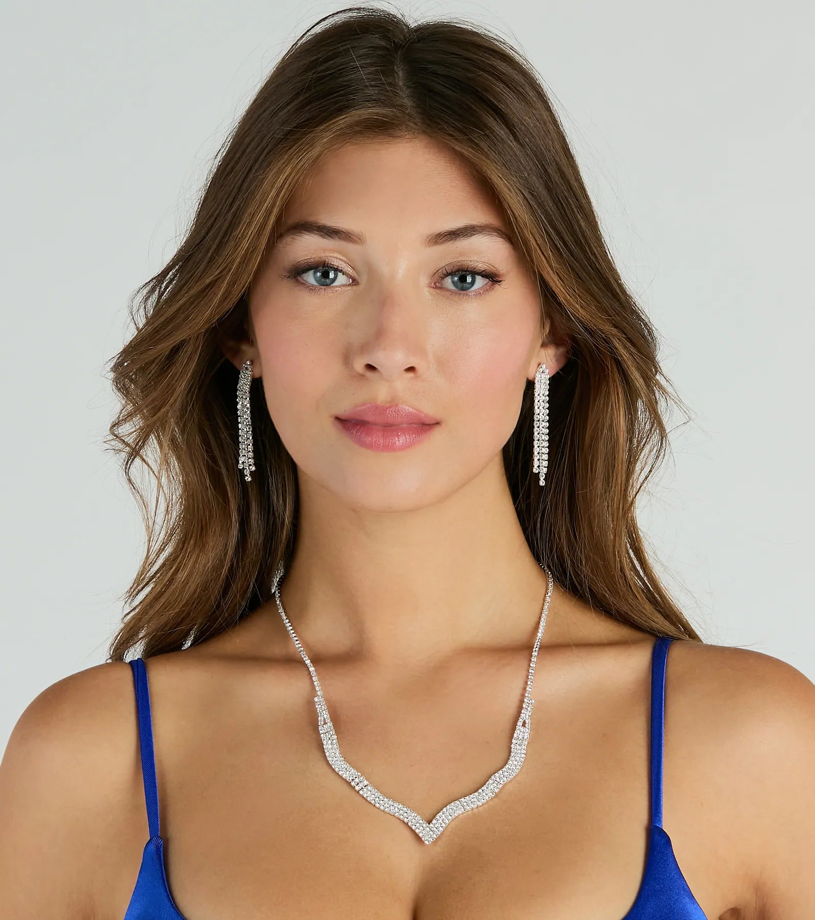 Captivate with your luxe allure in this sparkling rhinestone fringe necklace and earrings set! It features a V-shaped collar necklace with a single row of rhinestones leading to a chic curved multi-row rhinestone design. The matching long duster earrings feature an angled post with a multi-row rhinestone cascading fringe design. Style this gorgeous set with a and strappy stilettos for a black-tie wedding!