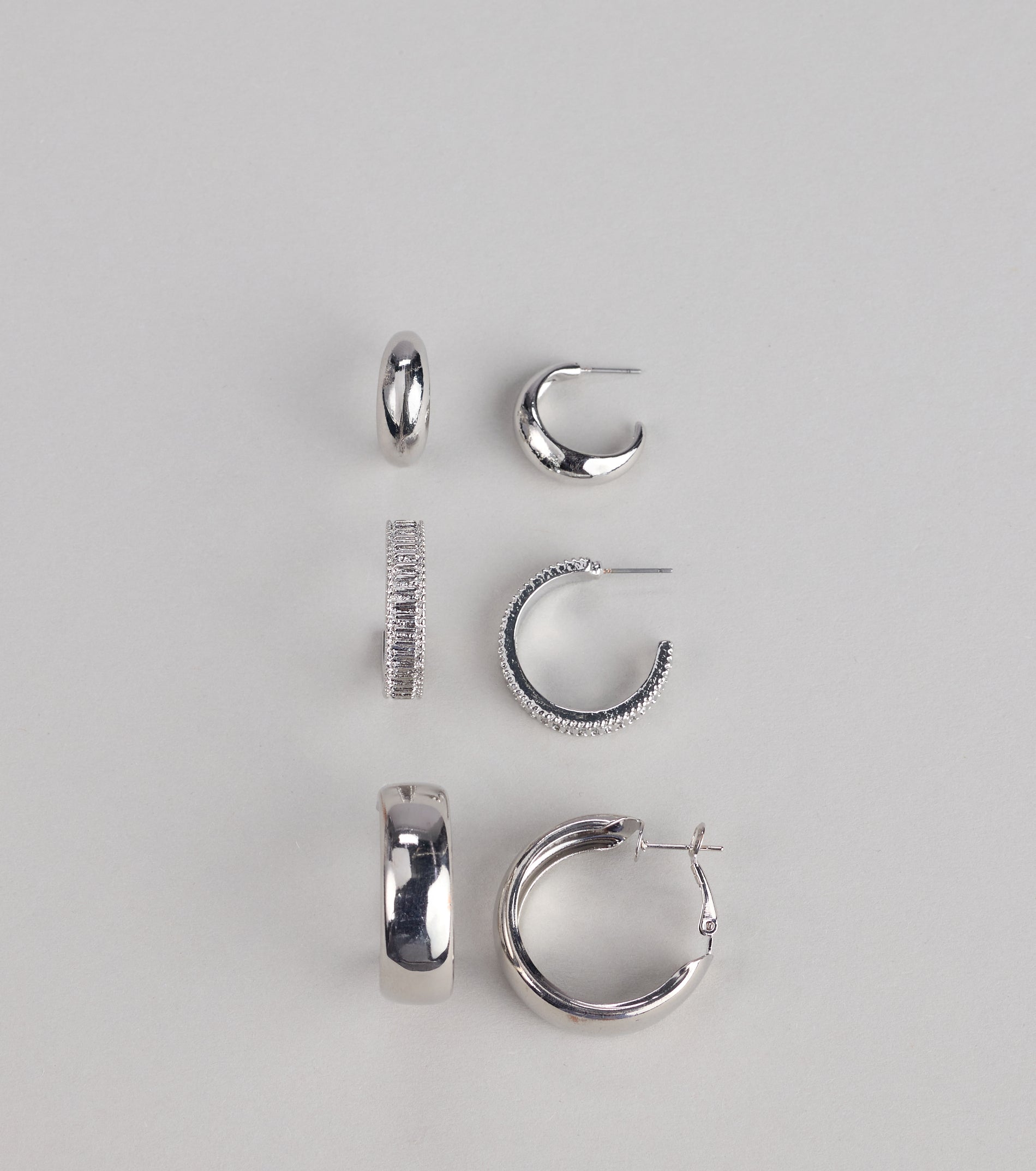 Why choose one when you can have them all? This hoop earring set gives you chunky. sleek. and rhinestone-detailed styles to mix. match. and stack for every vibe.