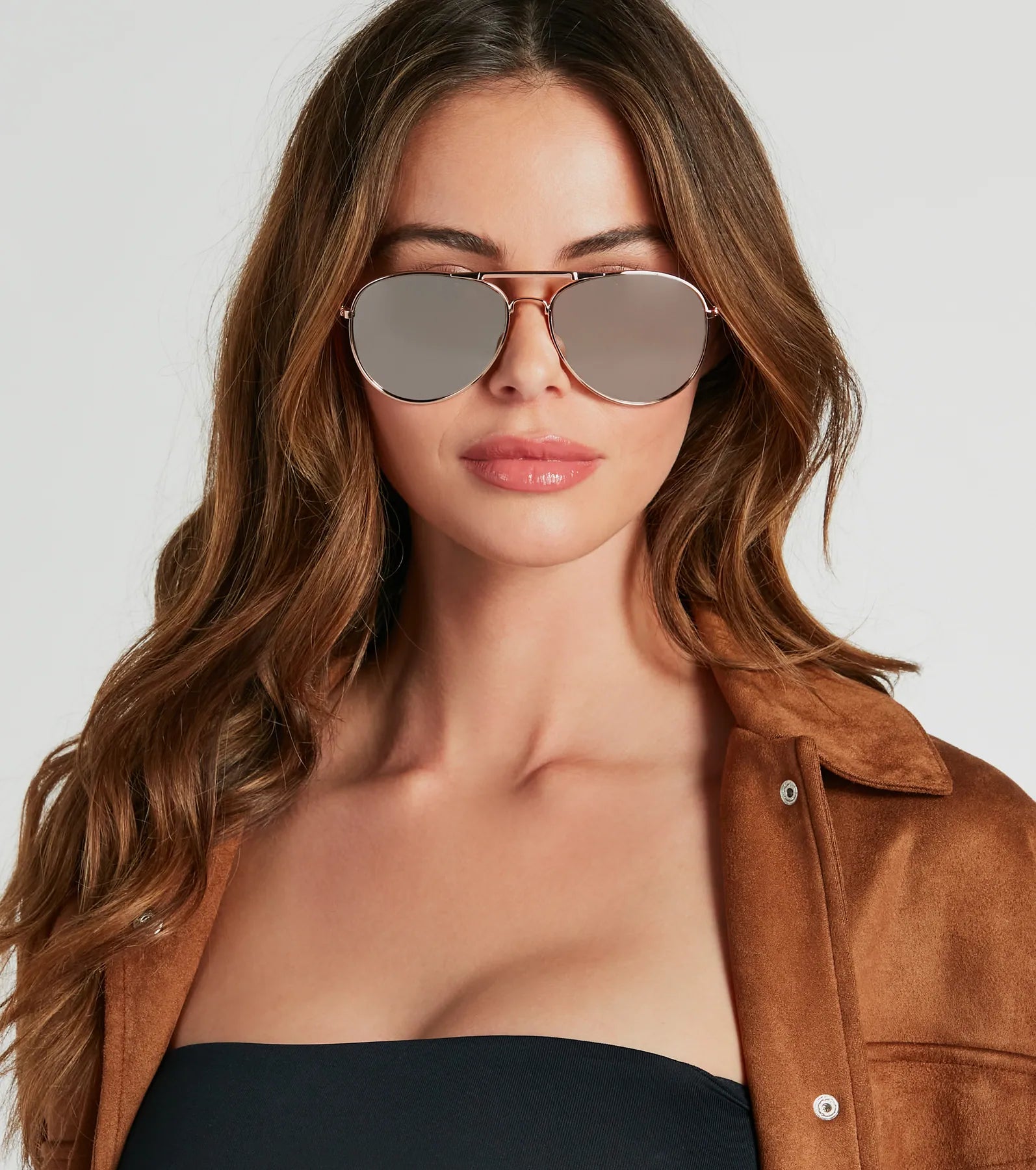 Everywhere you go in these aviator metal sunglasses you’re sure to stun! Featuring sleek colored metal frames and tinted lenses. you’ll be turning heads while enjoying 100% UV protection. Rubber nose supports and plastic arms provide comfort and durability. all in a classic aviator design. Complete the look with a dainty .