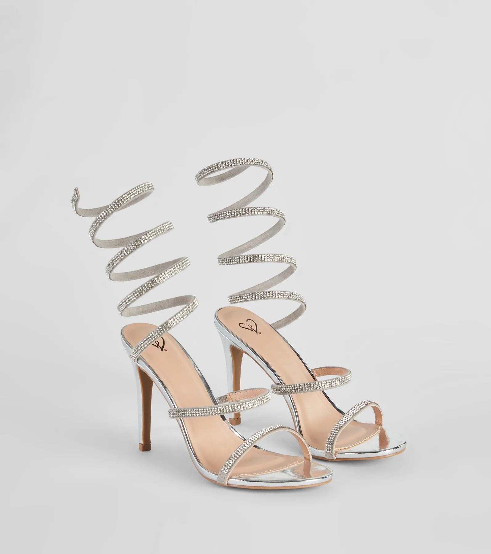 Show up to your special occasion with fancy feet! These chrome stiletto heels are perfect for achieving a glam look. They feature an almond toe and rhinestone spiral straps. Complete the look with a matching