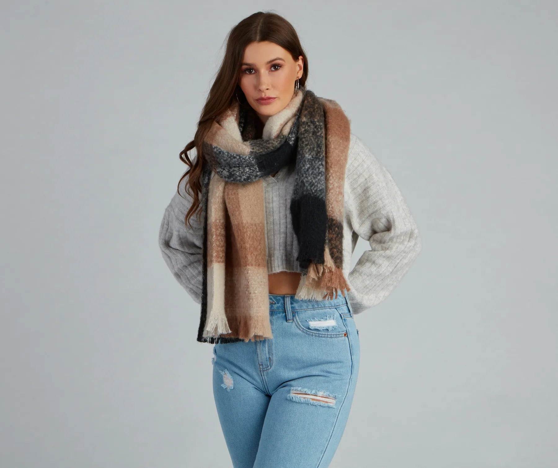 Your new stylish staple is this plaid scarf to keep cozy all season! It features a fringe edge composed of brushed woven fabric. Complete the look in suede