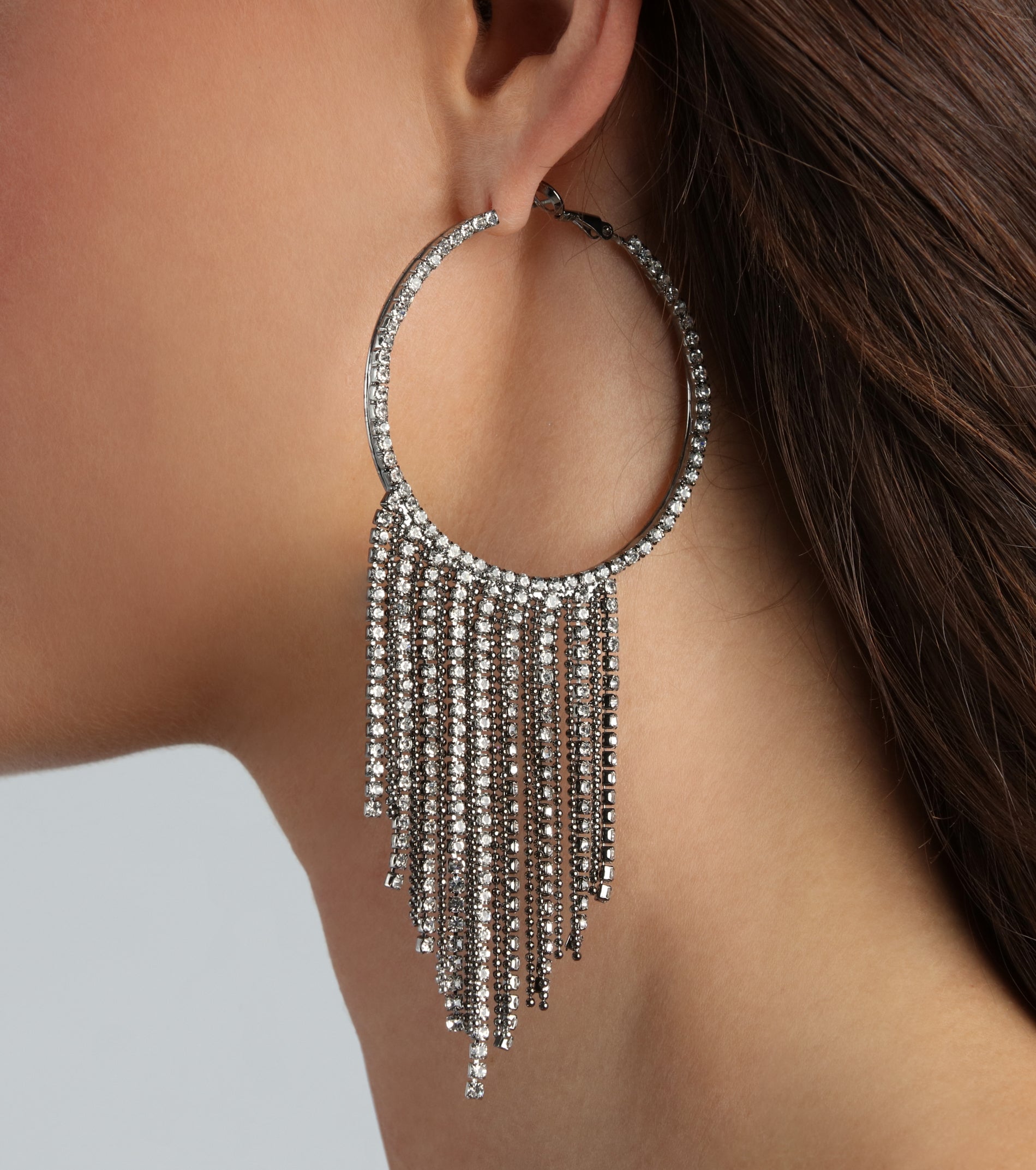 Make every outfit bold with these hoop earrings! They feature a rhinestone embellished hoop and cascading rhinestone and hematite bead fringe. Includes an omega closure. Complete the look with a sassy for a dinner date!