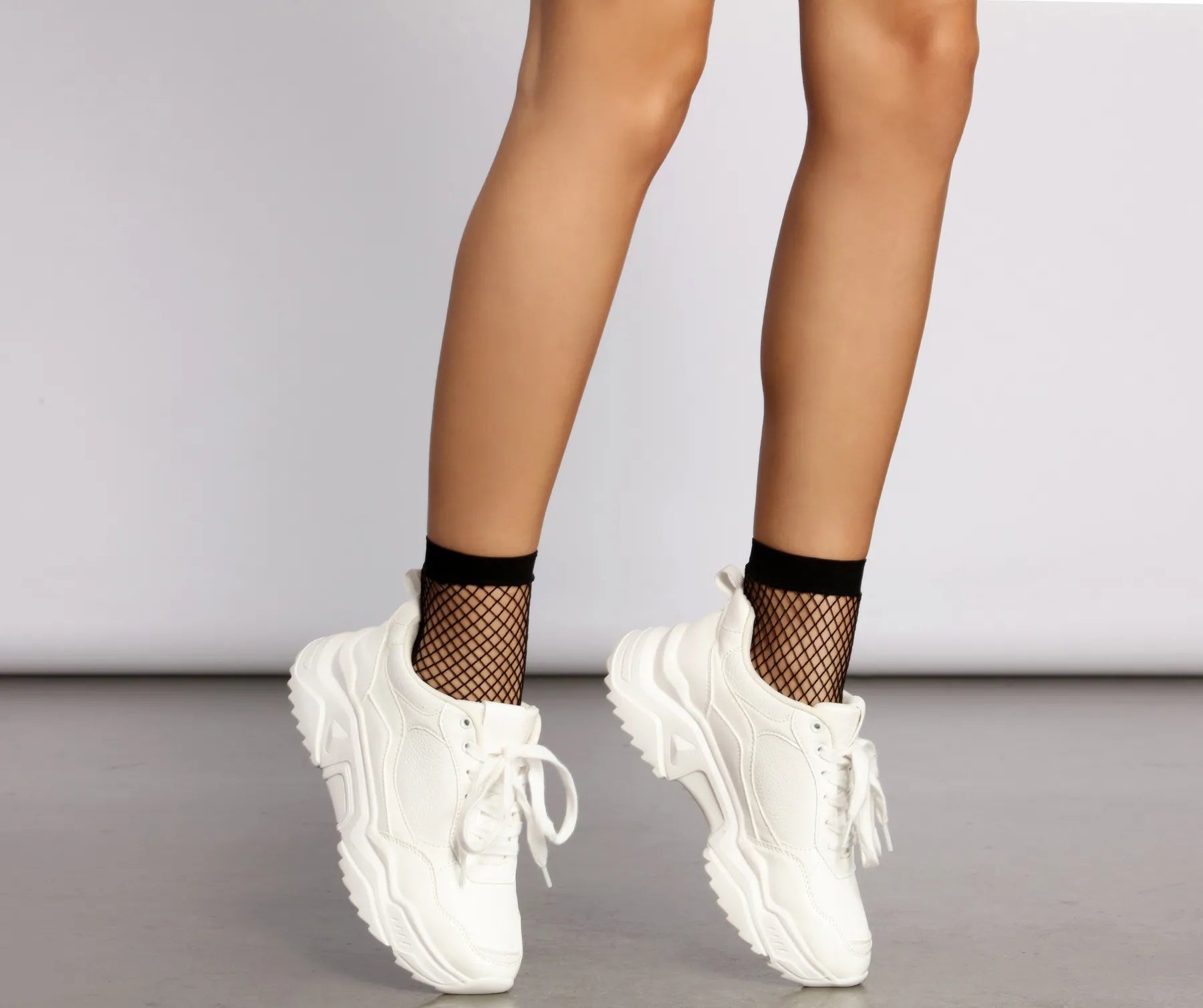 Keep on trend with socks to style with your favorite chunky sneakers. The socks feature a mid-calf fit with ribbed trim and a fishnet design.