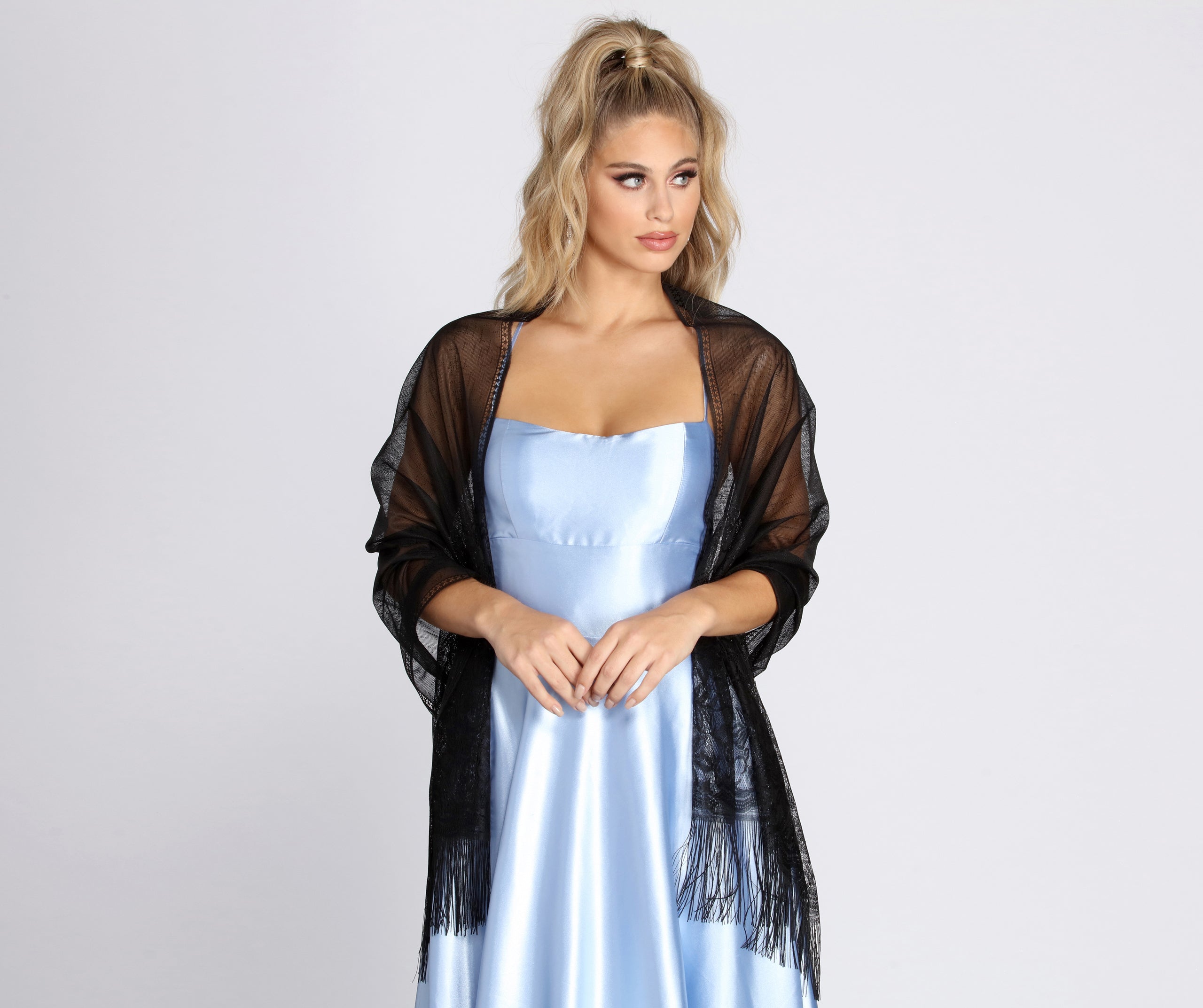 Keep it timelessly elegant with a this vintage inspired shawl! It features an intricate crochet design featuring floral inspired stitching. and a fringed hem. Shawl is composed of a lightweight crochet knit fabric.