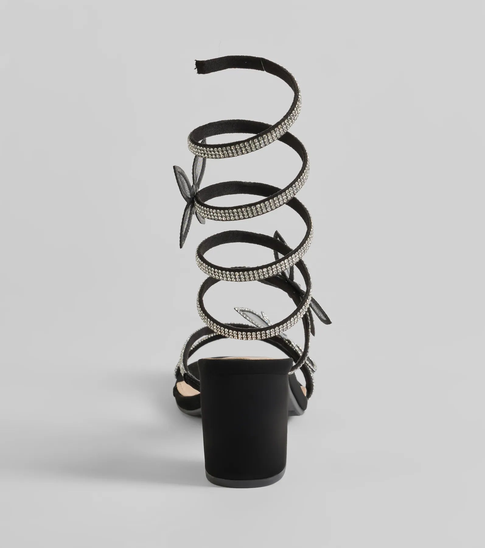 Flutter into these fashion heels featuring a round toe. rhinestone embellished straps with butterflies. and a block heel. Perfect for dressing up your formal wear.