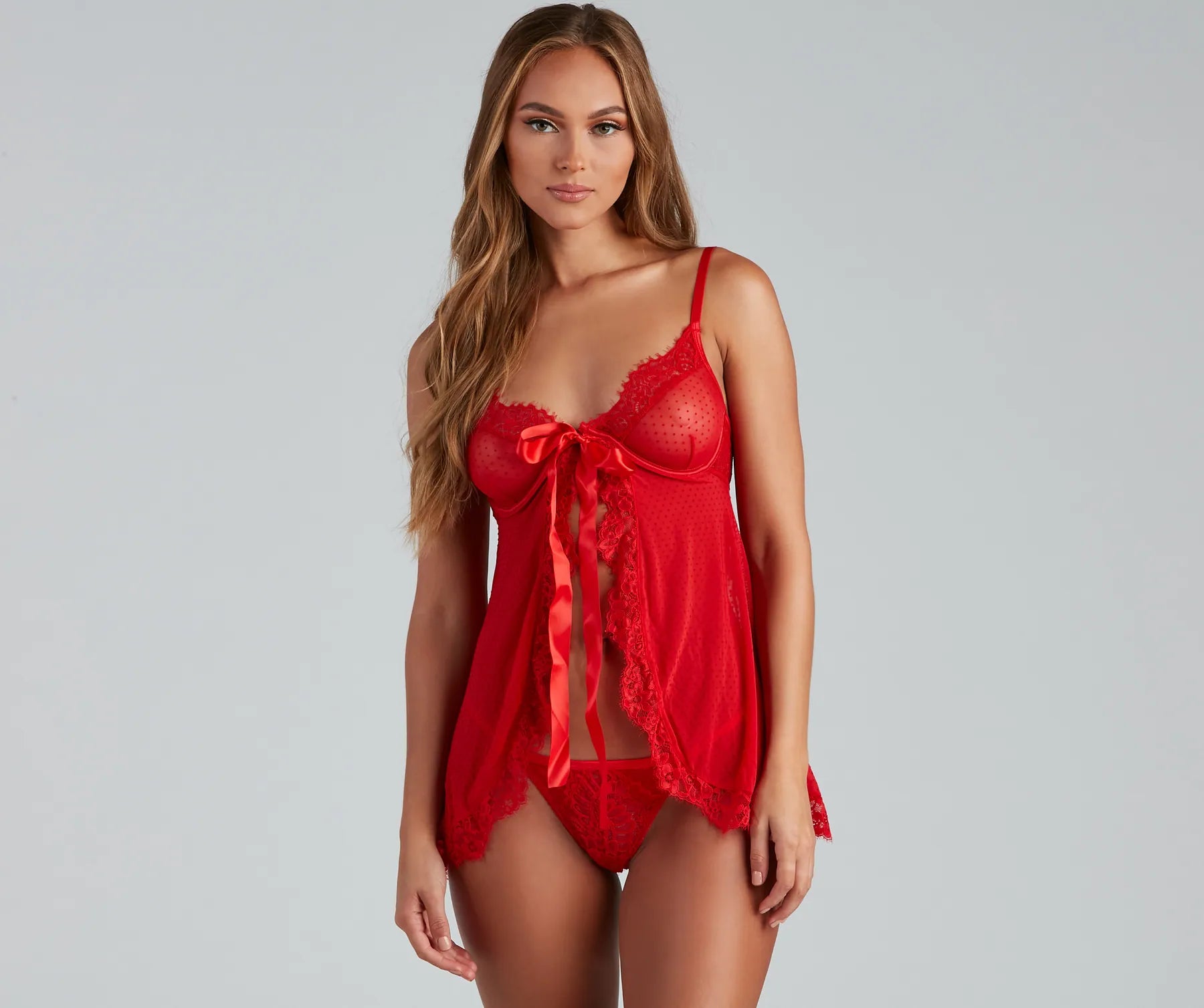 Get a forever sultry look in this sheer mesh and lace lingerie set! It features a babydoll dress with wired cups. a tie-front ribbon detail. an eyelash lace trim. spaghetti straps. and a flowy silhouette. The set also features a matching panty with a thin strappy design and a thong bottom. Style this set with a .
