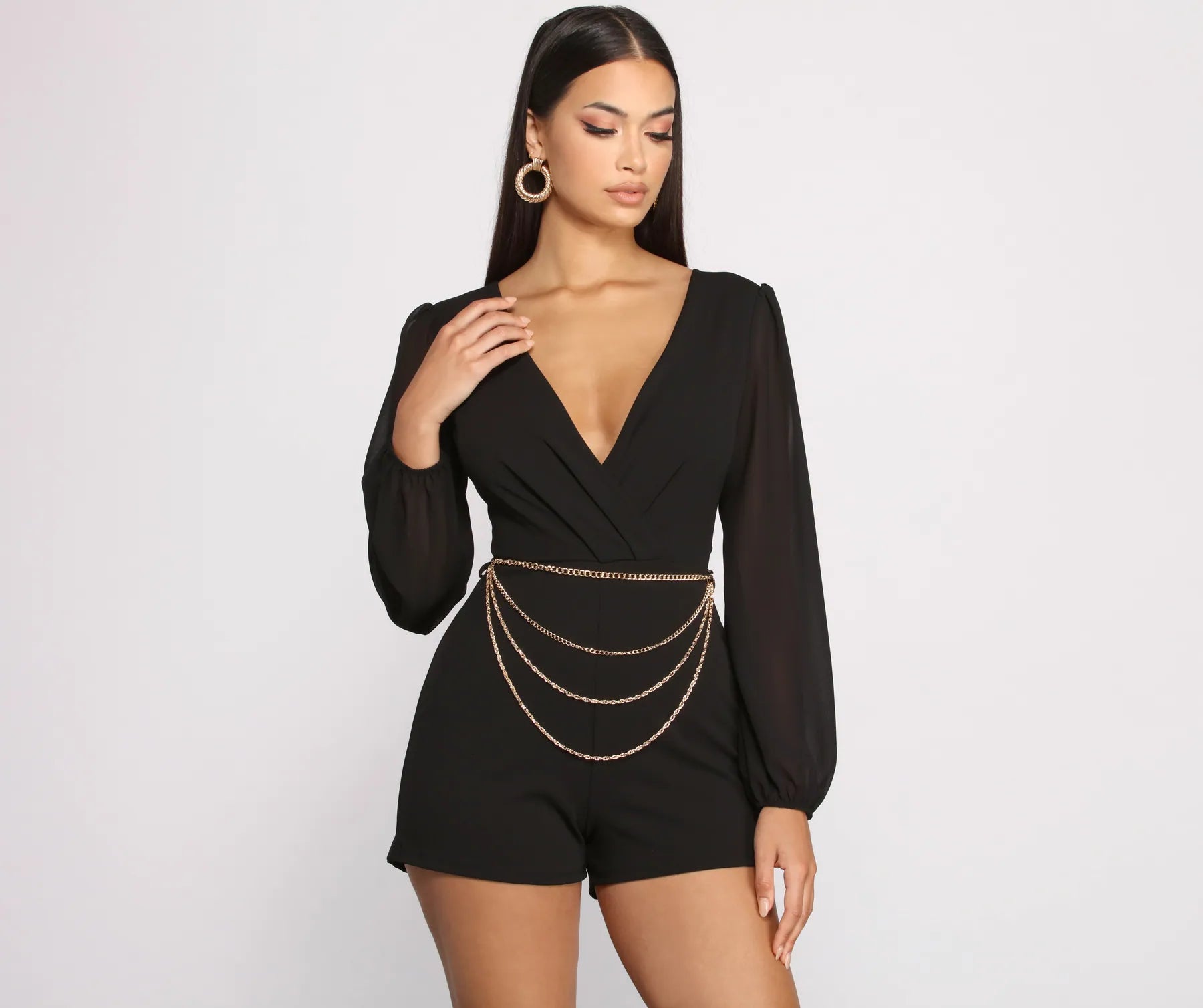 We love a trendy swag belt to add some bling to a chic outfit! This swag belt features a four-row tiered design and a chunky chain-link design. Complete outfit with and .