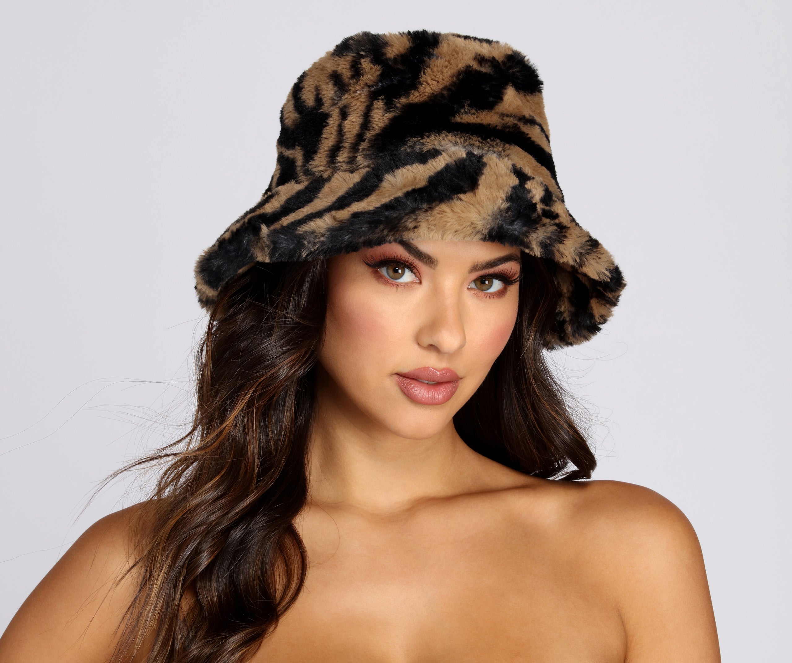 Have a little fun with something unique this season! Bucket hat features a downward brim. and is composed of a faux fur material that is soft. funky. and cute.