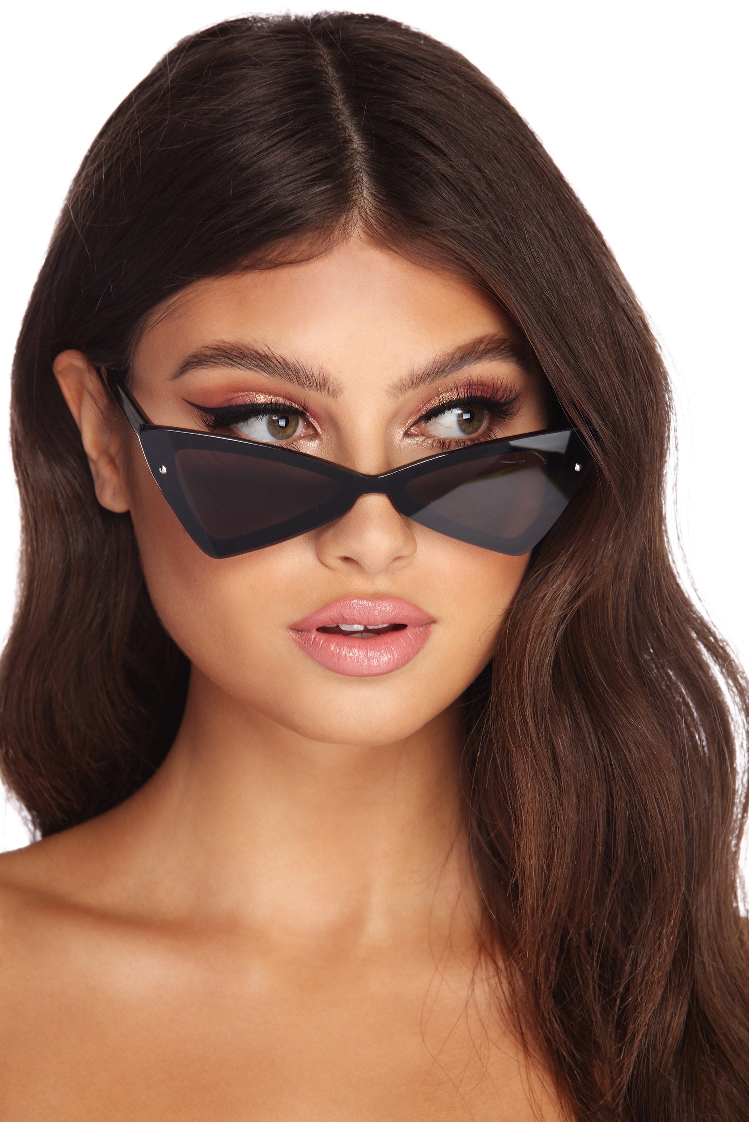 We’re raving about these trendy. retro black sunnies! They feature a geometric cat eye design with rimless lenses.?