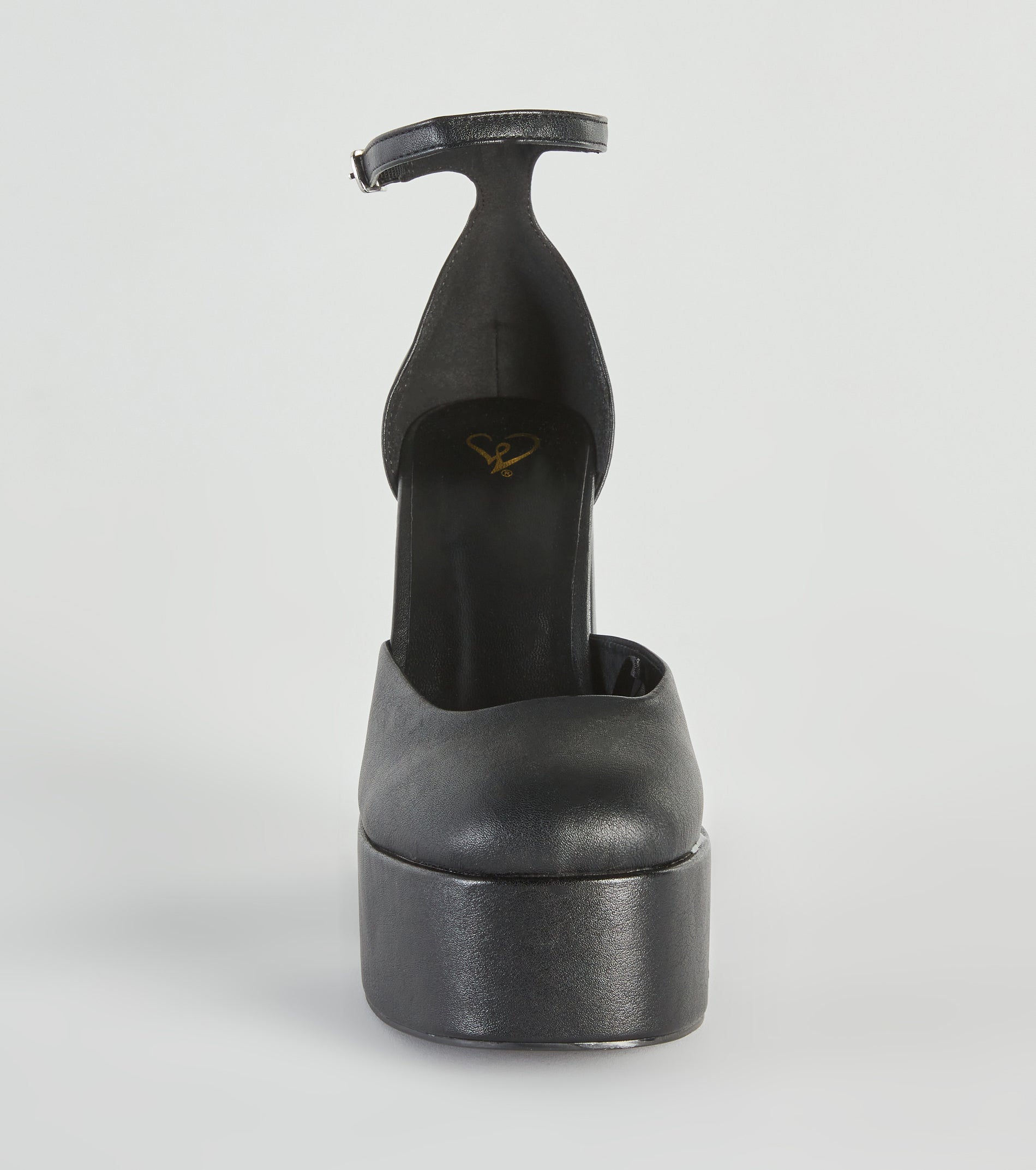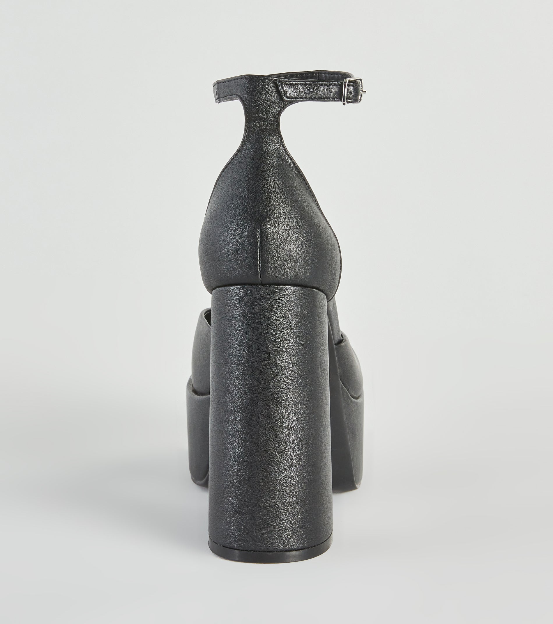 These chic of-the-moment platform pumps will garner all the attention! They feature a closed almond toe. a closed back. a thin adjustable ankle strap. a bold platform sole. and an ultra-tall block heel. Style with a sleek for your next night out.