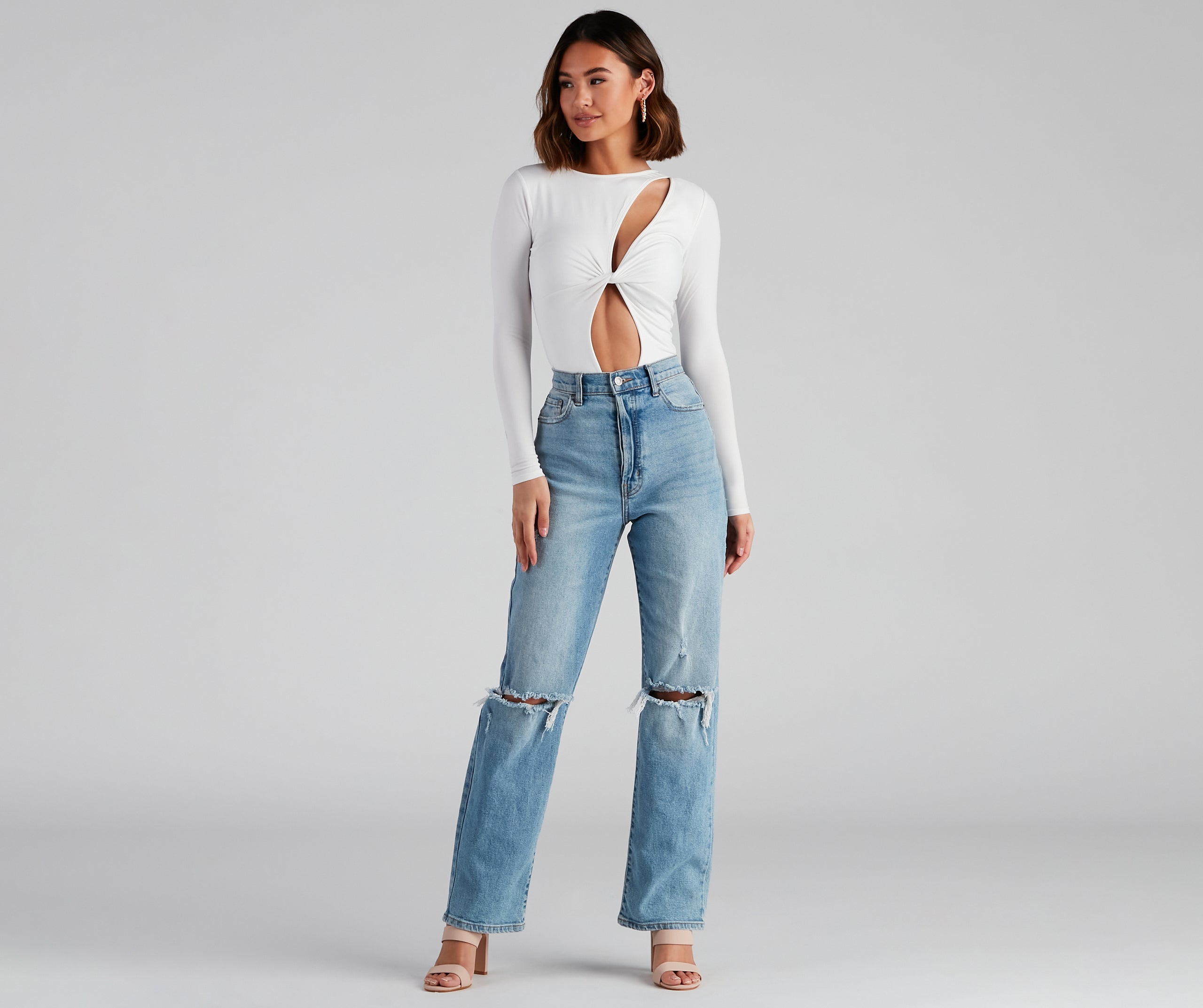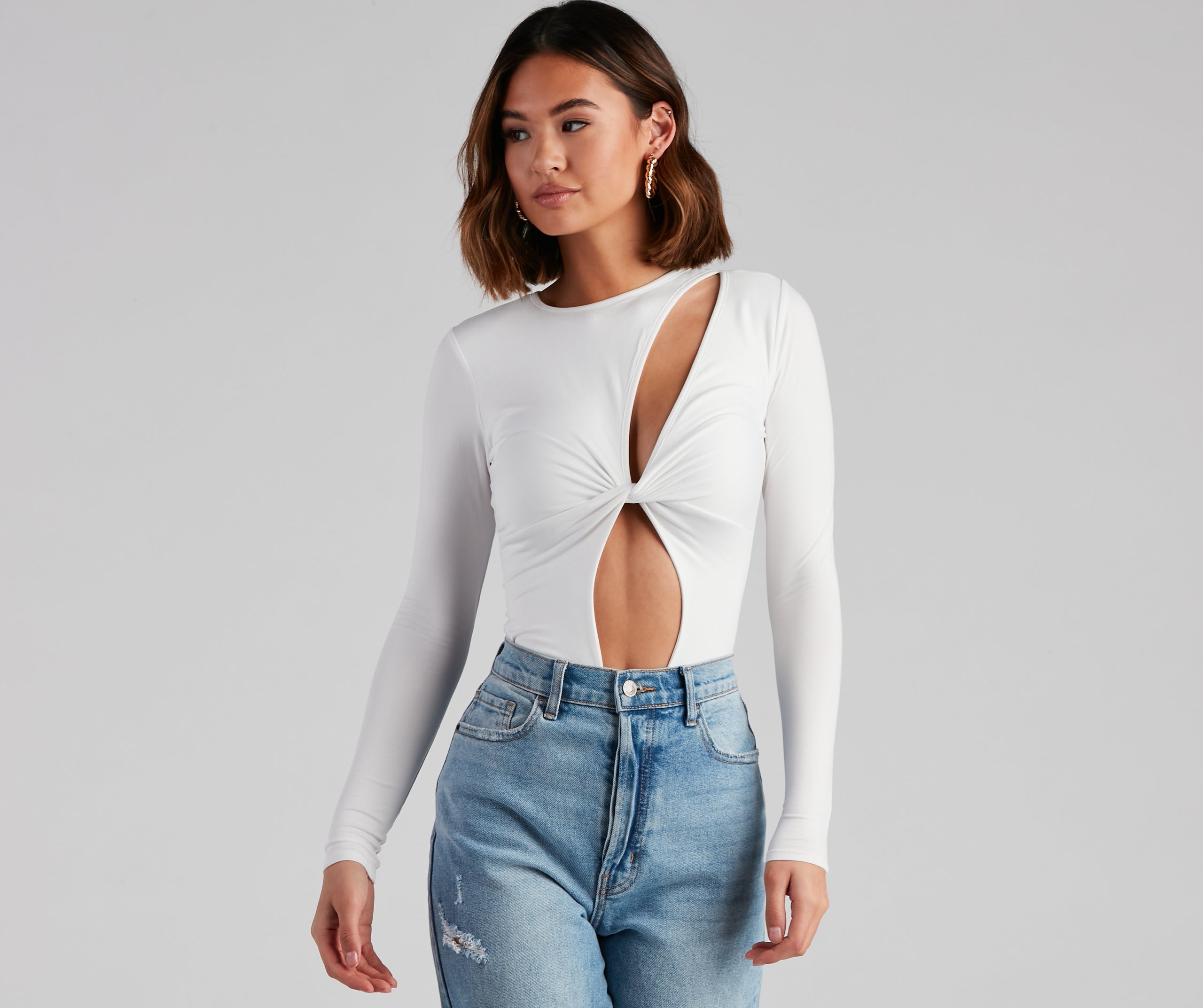Elevate your basics in this long sleeve bodysuit featuring a crew neck and a sultry front cutout design with a twisted bodice. dual snap closure. and a thong cut bottom. Complete the look in