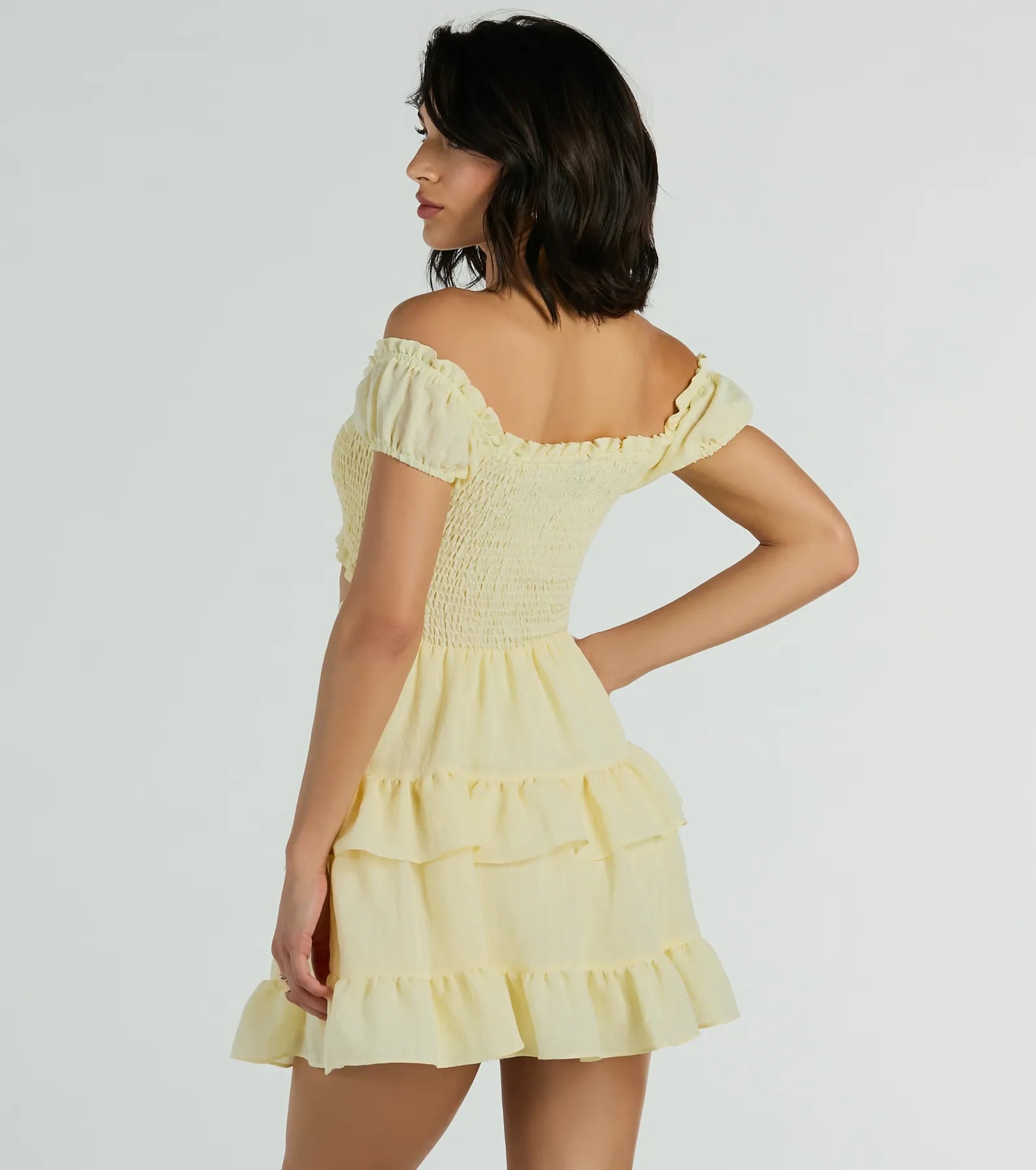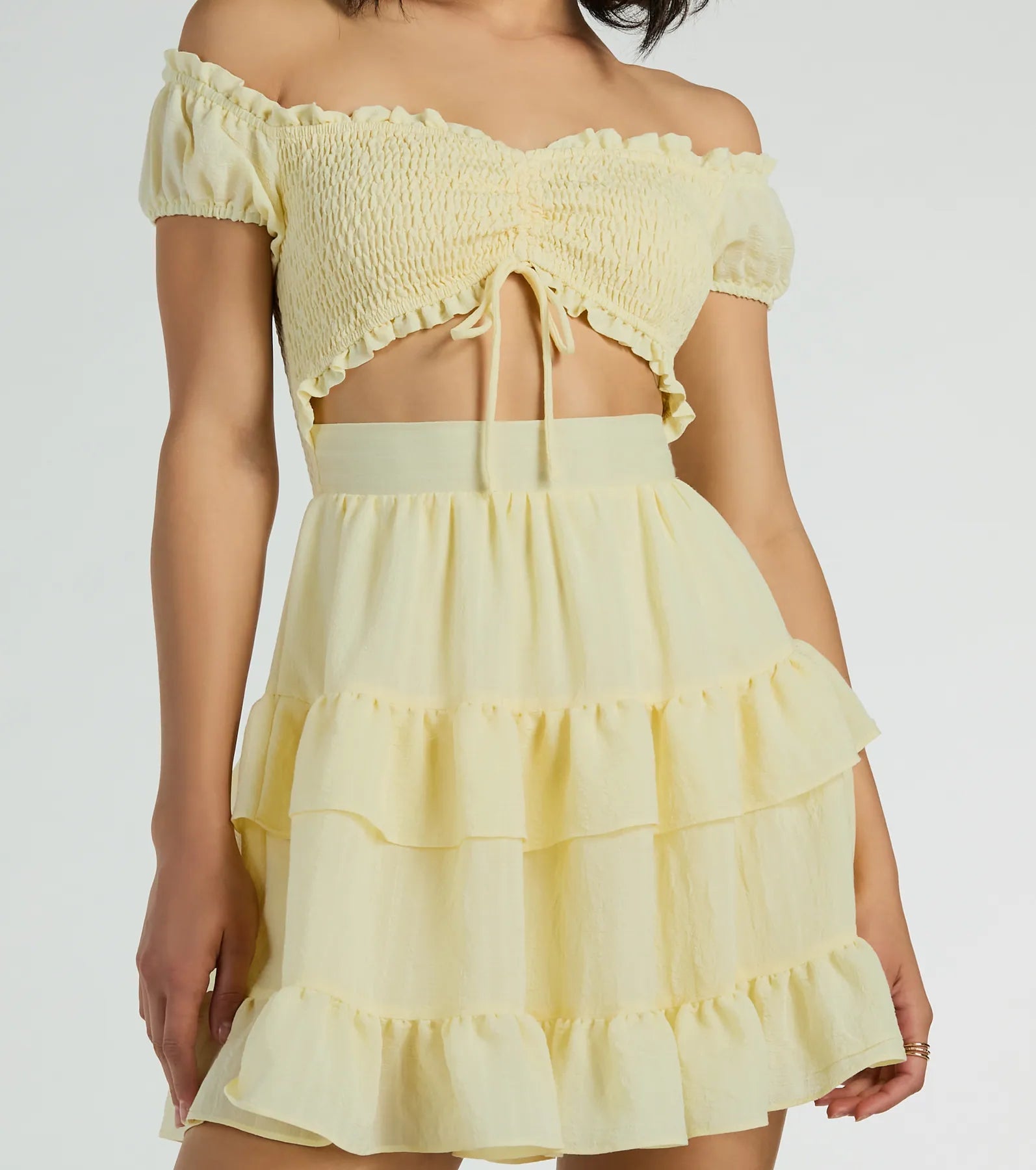 Embrace a girly-core coquette aesthetic in this skater dress perfect for sunny days! The sweetheart neckline and cutout waist add a flirty touch. while the stretchy smocked bodice hugs your curves. and the ruffled tier short-length hem adds a feminine flair. Complete the look in .