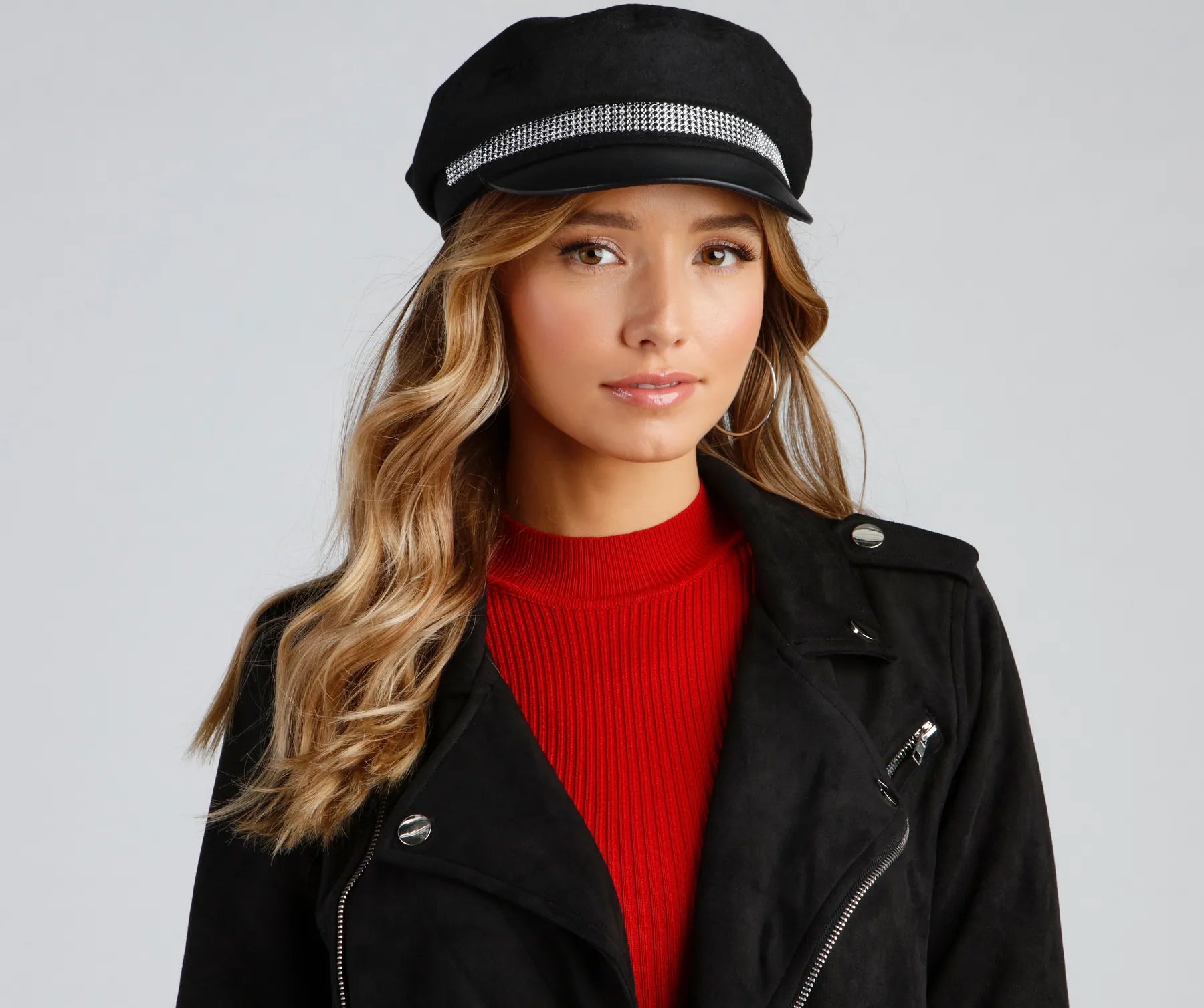 Get glam in the city wearing this cabby hat featuring a rhinestone band. faux leather brim. and a traditional cabby design. Complete the look with sparkly and a jacket.