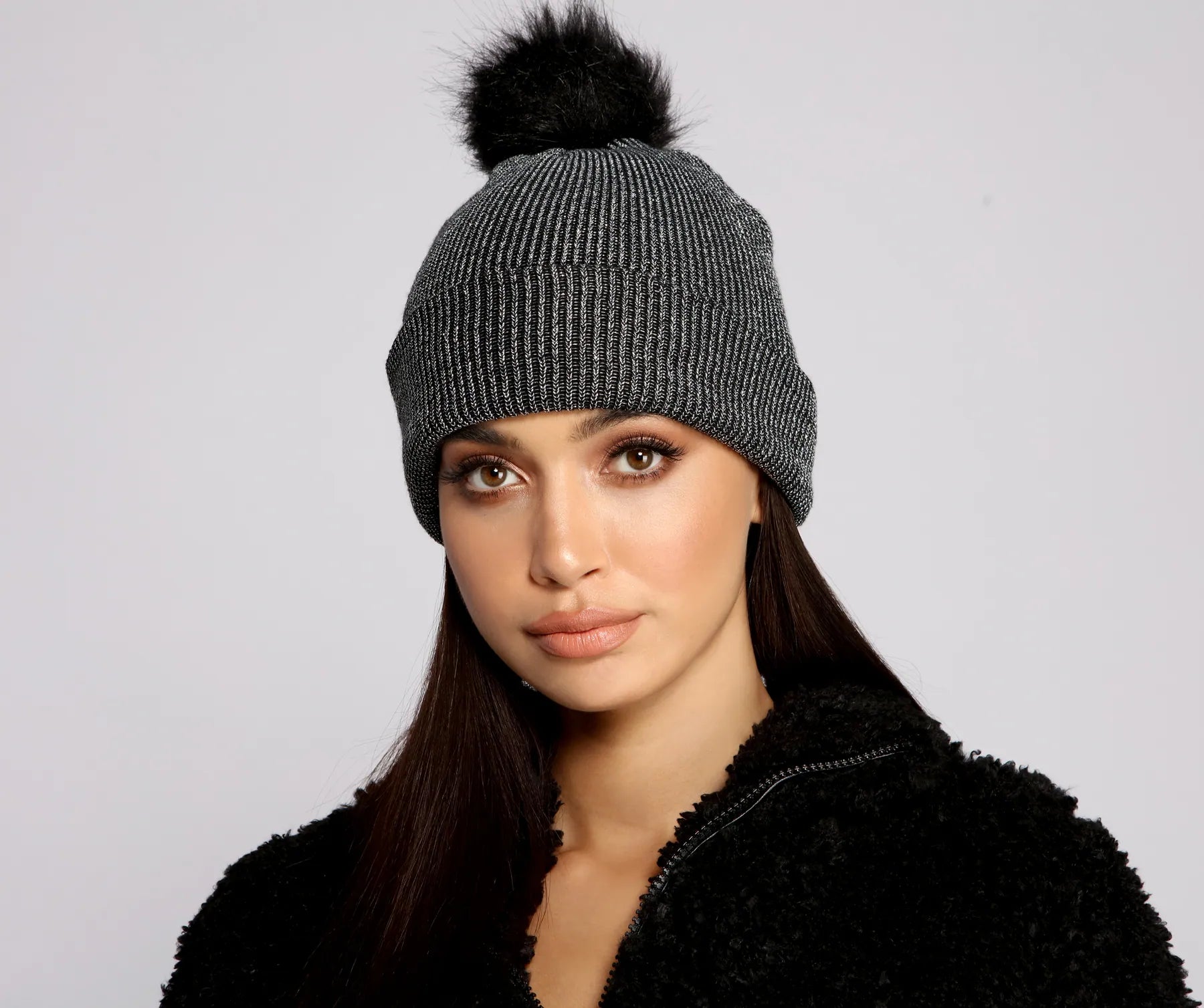 Stay cozy while also keeping your look glam in this adorable beanie! It features a lurex knit fabric with a faux fur pom accent. Pair this beanie with a and for the perfect winter night out look.