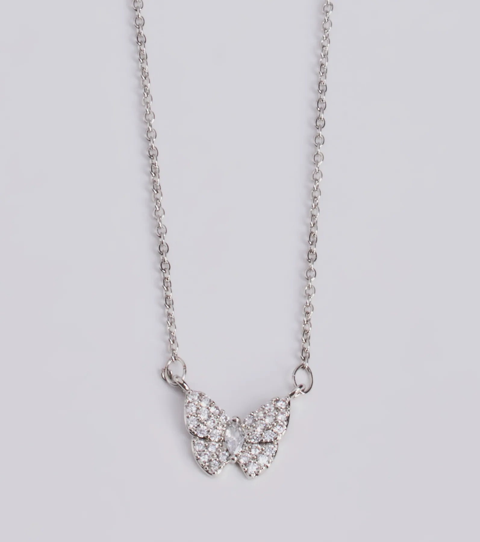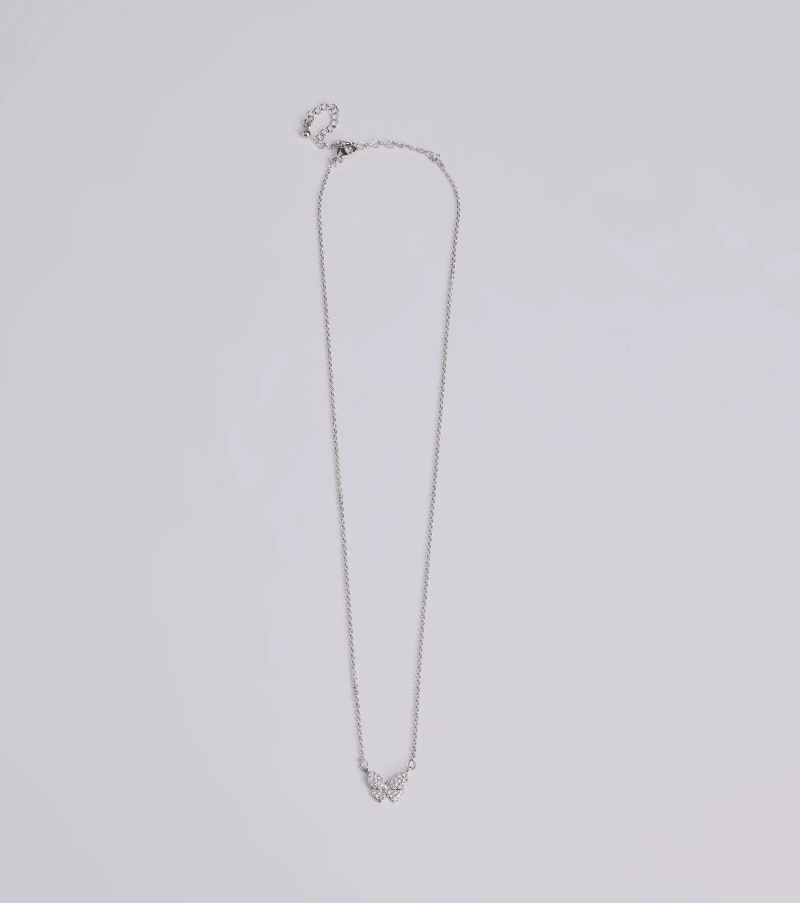 A cute rhinestone butterfly charm necklace that you’ll love pairing with a chic dress or polished trench coat.