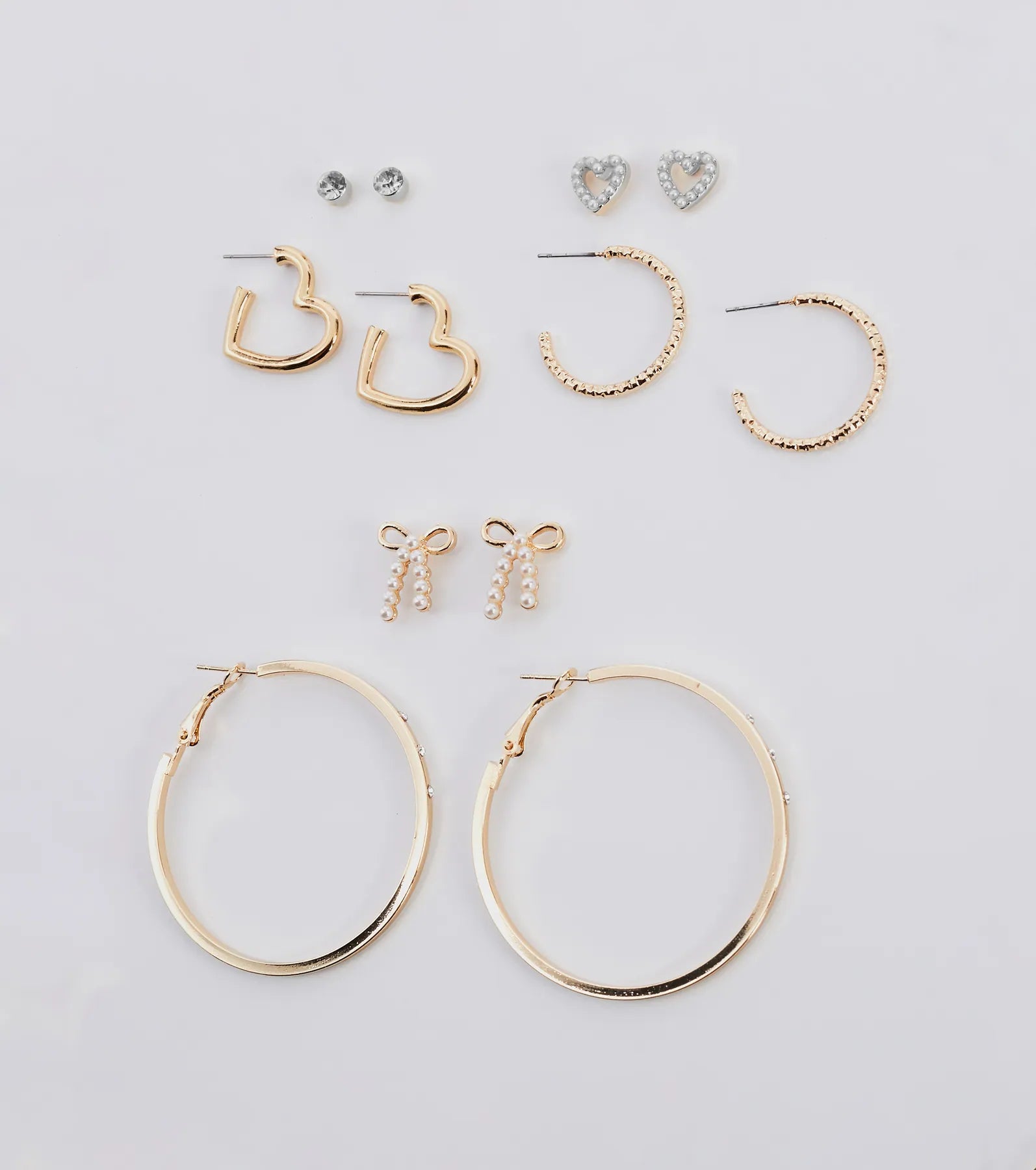 Glam up your fave ‘fits with this glitzy stud and hoop earring set! It features sparkly round rhinestone studs. heart-shaped outline studs embellished with mini faux pearls. bow-shaped studs adorned with faux pearls. small heart-shaped hoops. medium textured hoops. and large hoops with mini rhinestone accents. Style with a .