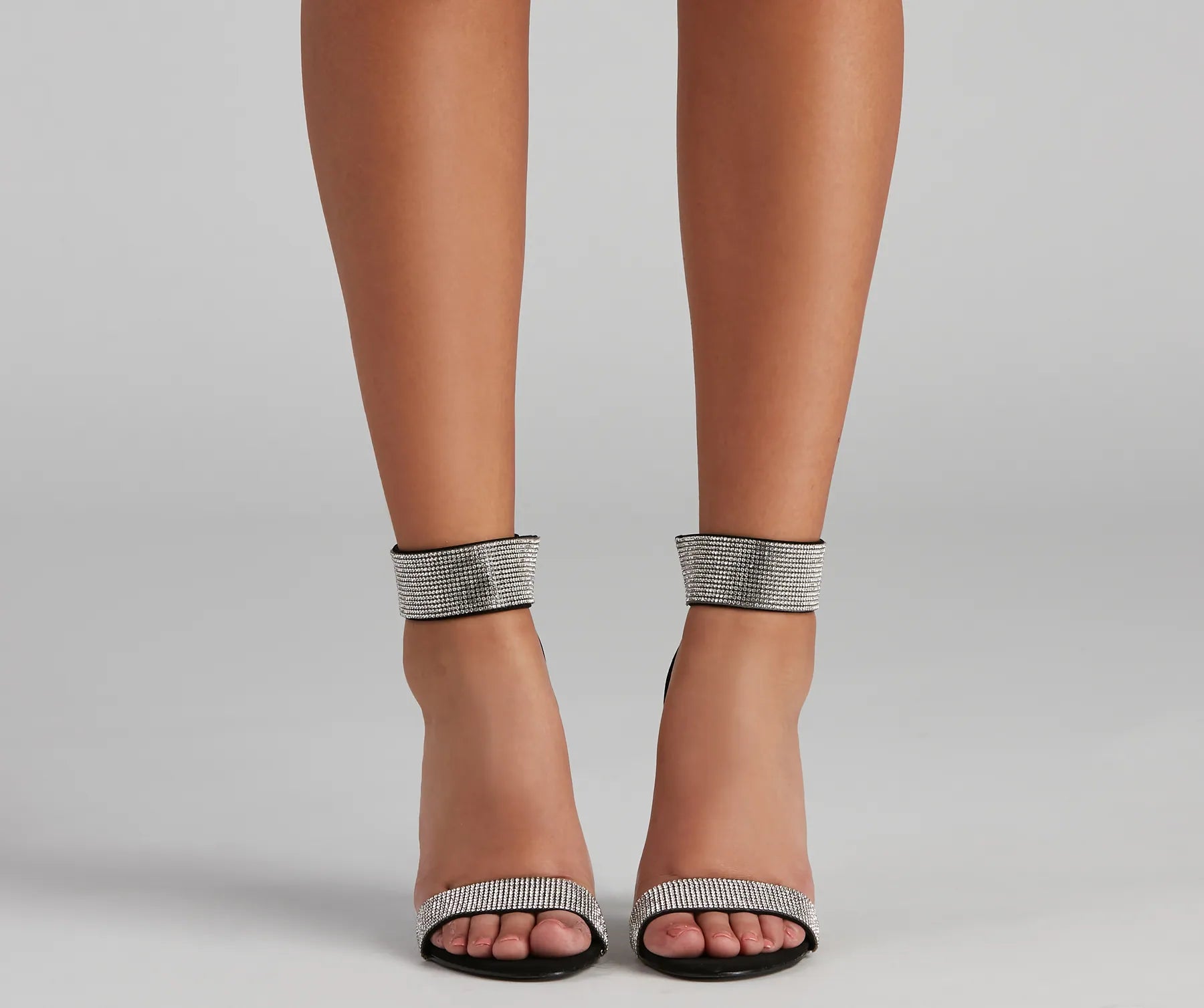 Everyone will be glam-struck by these stiletto heels! They feature an almond toe. stiletto heel. rhinestone straps. and zipper closure on nubuck material. Complete your look with a luxe