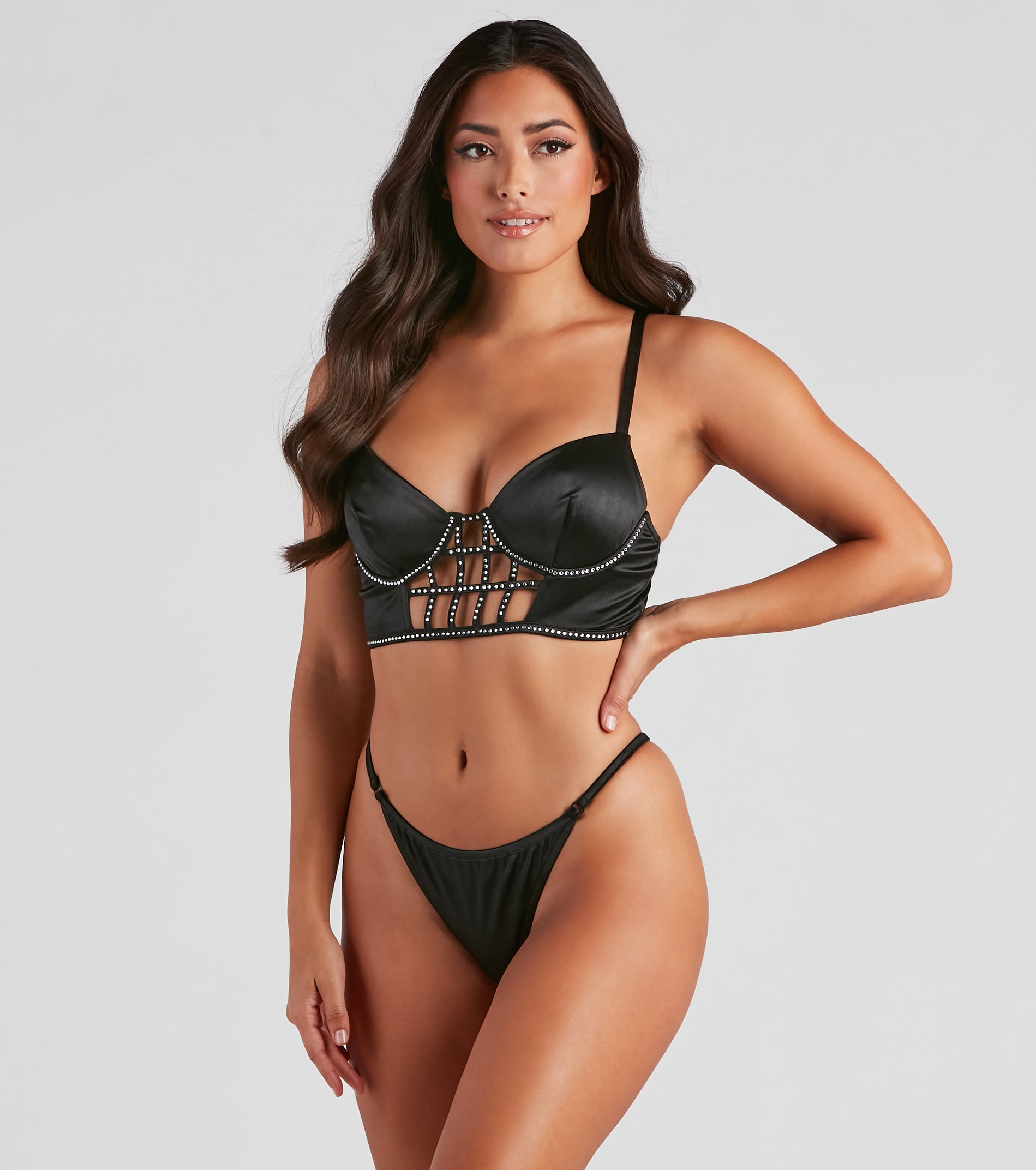 Some gifts are wrapped up and tied with a bow sitting under the tree…but you’ll be the glam surprise instead for your honey! Sultry it up tonight in this lingerie set featuring a rhinestone trim bra with caged detailing and a sleek. minimal thong panty. Complete the look in voluminous false
