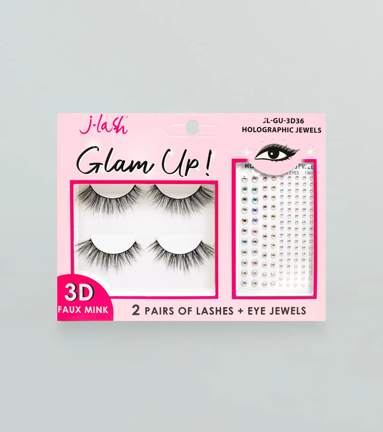 Glam up with this faux lashes and eye jewels set for a simply dazzling makeup look! Just follow the easy three-step application to set and trim. glue. press. and wow everyone at the party. The set of 3-D faux lashes is reusable if placed gently on the tray to keep safe for next time! Give your eyes a pretty shine using the eye jewels perfect for placing around the eyes however you like. Accessorize with for your next semi-formal or dressy event.