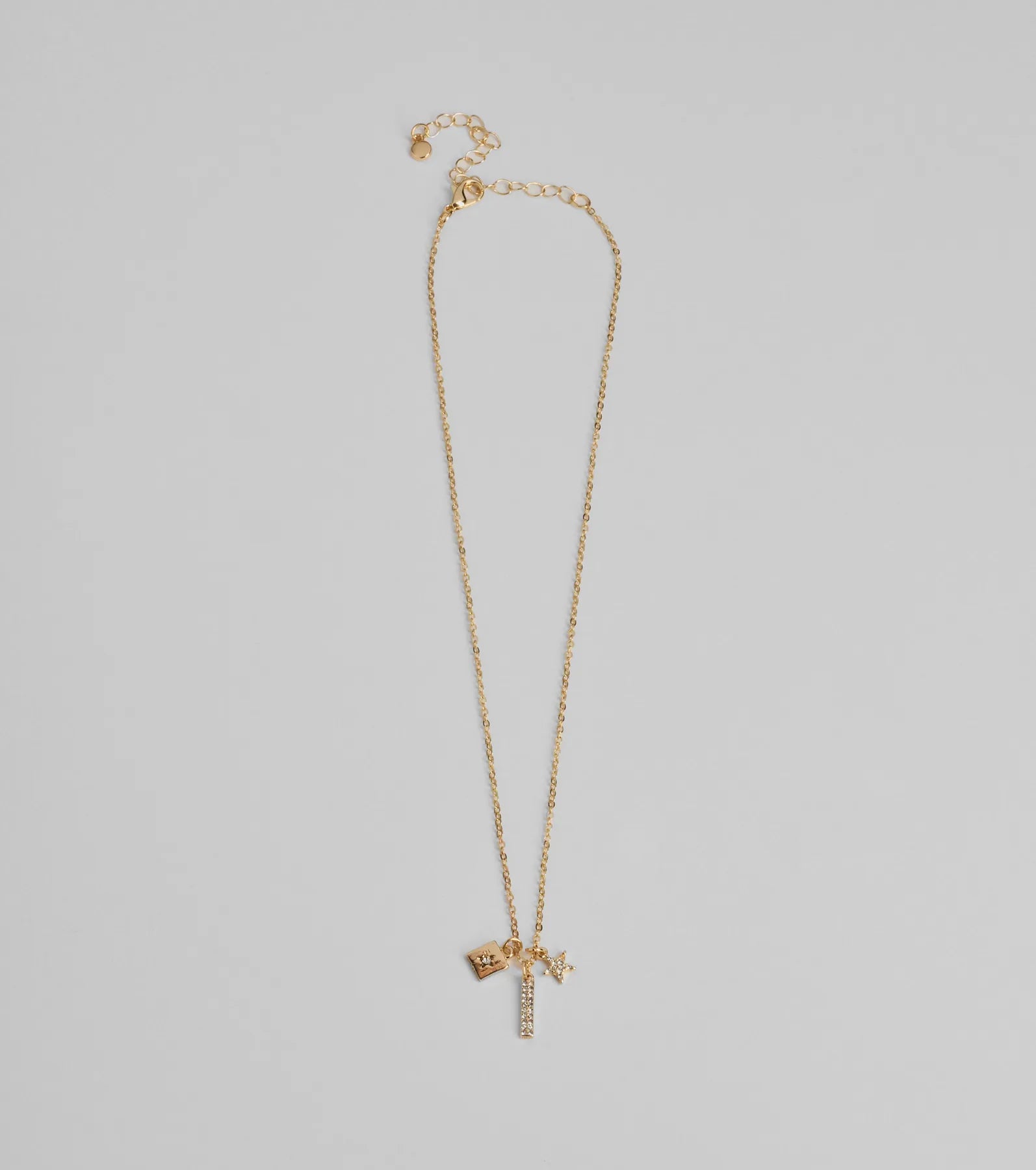 The celestial charm necklace features a dainty chain accented with a lock charm with a mini rhinestone star. a rhinestone-embellished bar charm. and a rhinestone-embellished star charm for a pretty glam sparkle.