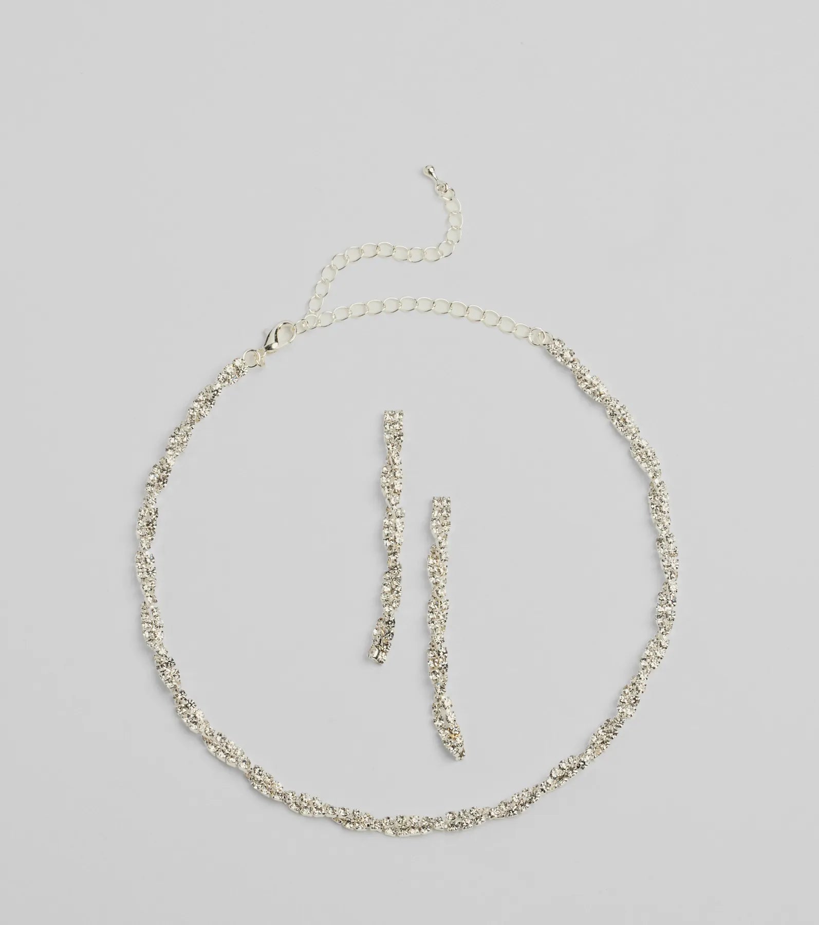 A glamorous necklace and earrings set featured in an exquisite twist design embellished with dazzling rhinestones to adorn your formal look. Pair with block heels.